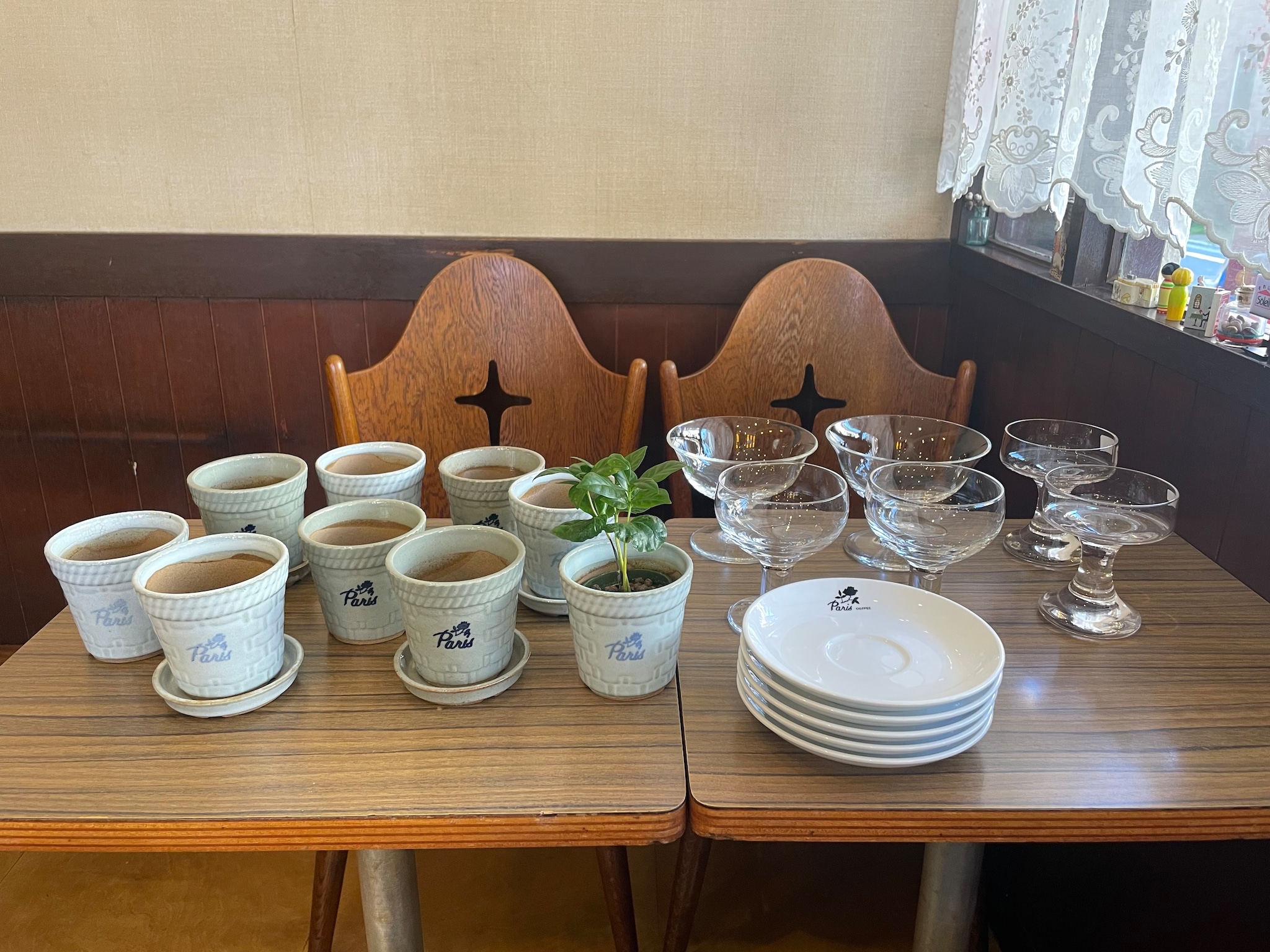 その後、昨年に店主のご家族より、当時に作られたロゴ入りの植木鉢、ソーサー、使われていた照明などをお引取りさせていただきました。また、パリさんの2号店で使われていたというデザートグラスなどもありました。