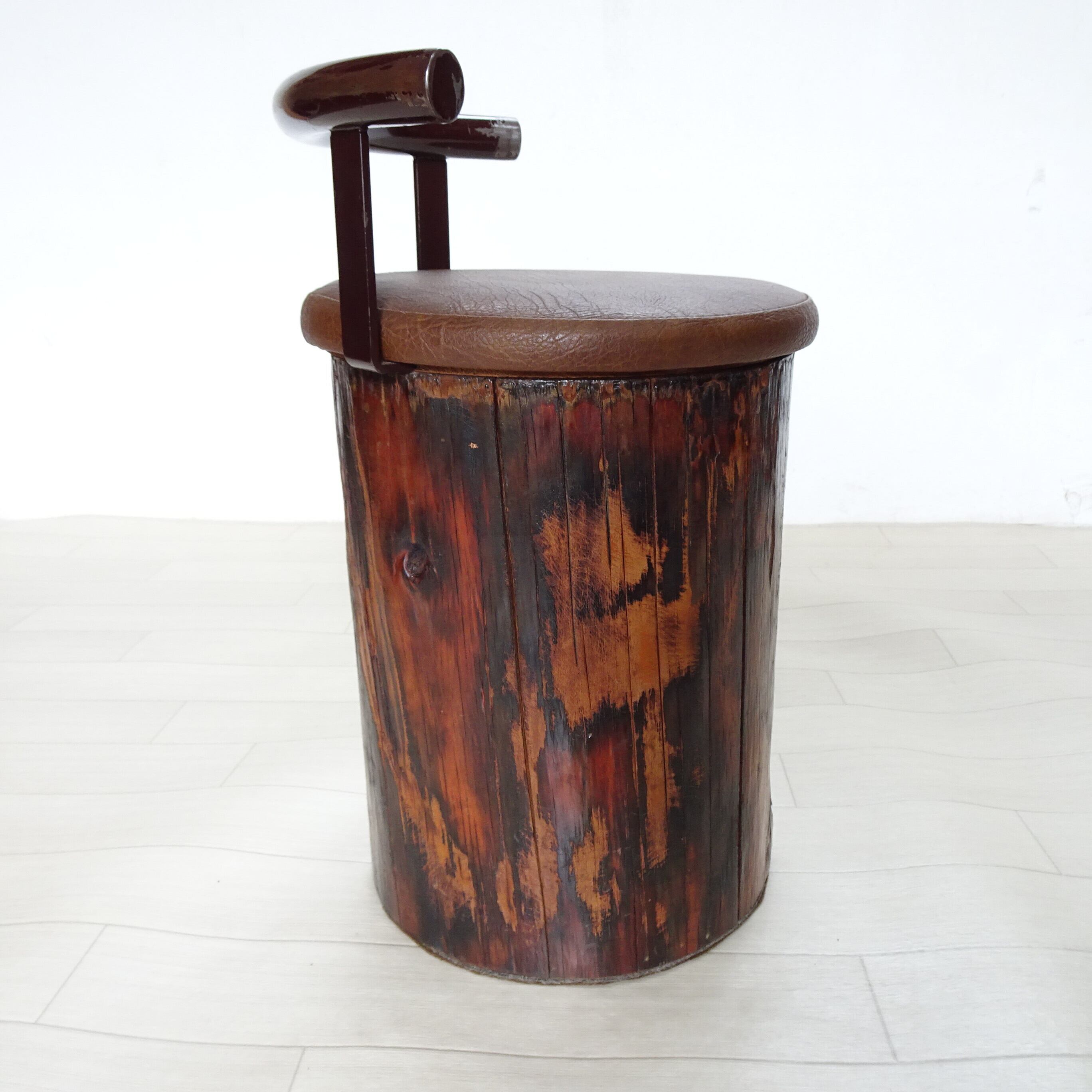 背もたれは金属製(スチール)、大きな丸太にビニールレザーのクッションが貼付けられています。背もたれはスレ、キズ、塗装のはがれがあります。