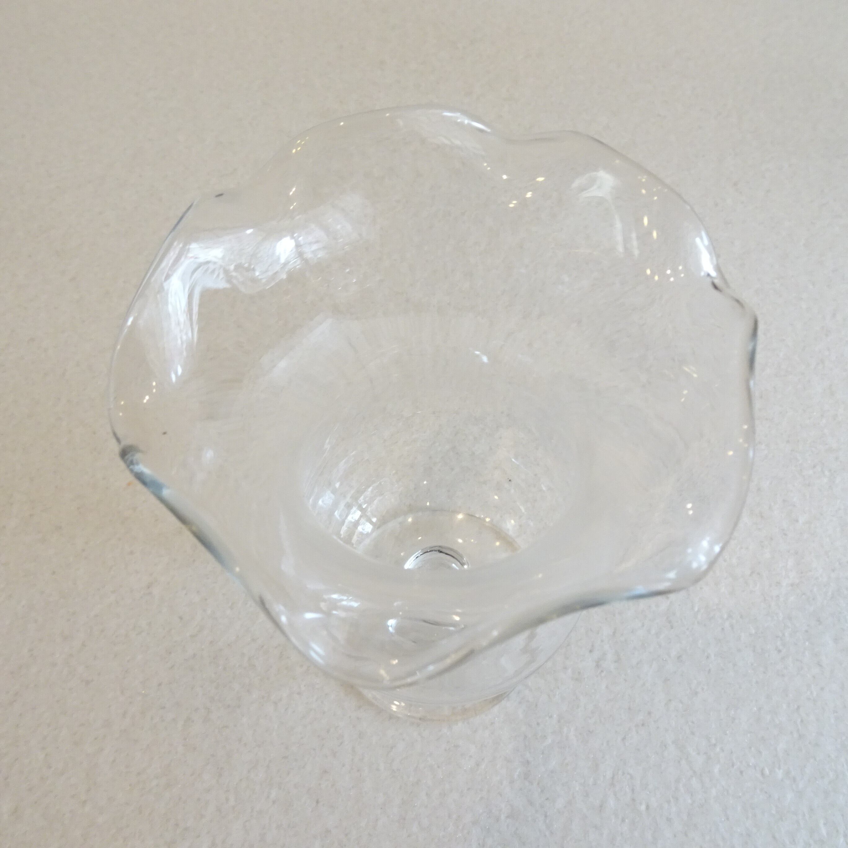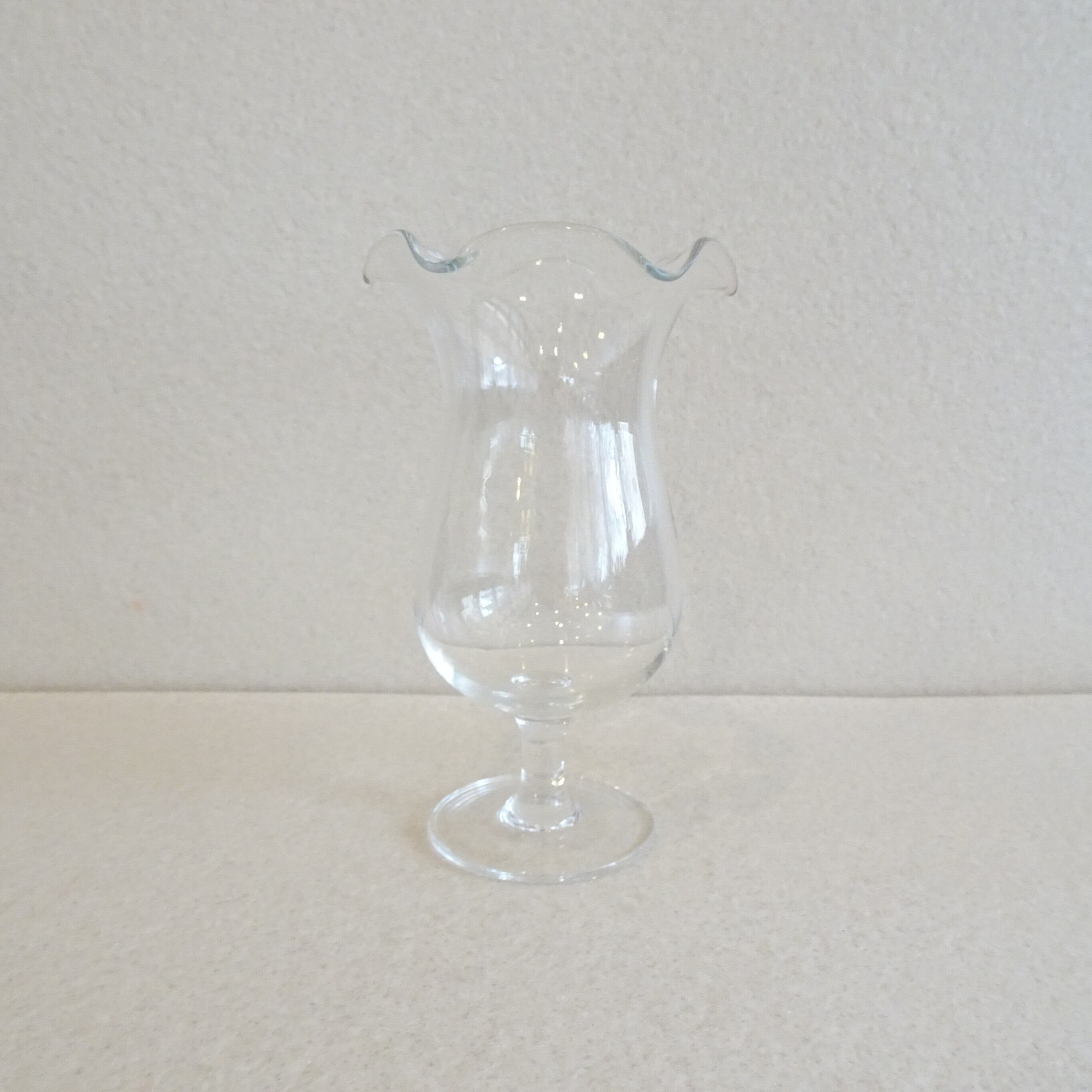 そしてカフェクイーンはこちらの口元がフリルのようになったグラスで共通して提供されることが多いように感じます。実際、当店でも過去にトーアコーヒー系列の複数の喫茶店からこちらのグラスをお引取りしたことがあります。おそらくトーアコーヒーさんが各店舗に同じ食器卸の業者さんを紹介するなどして、同じ食器が各店舗で使われていたのかと思います。