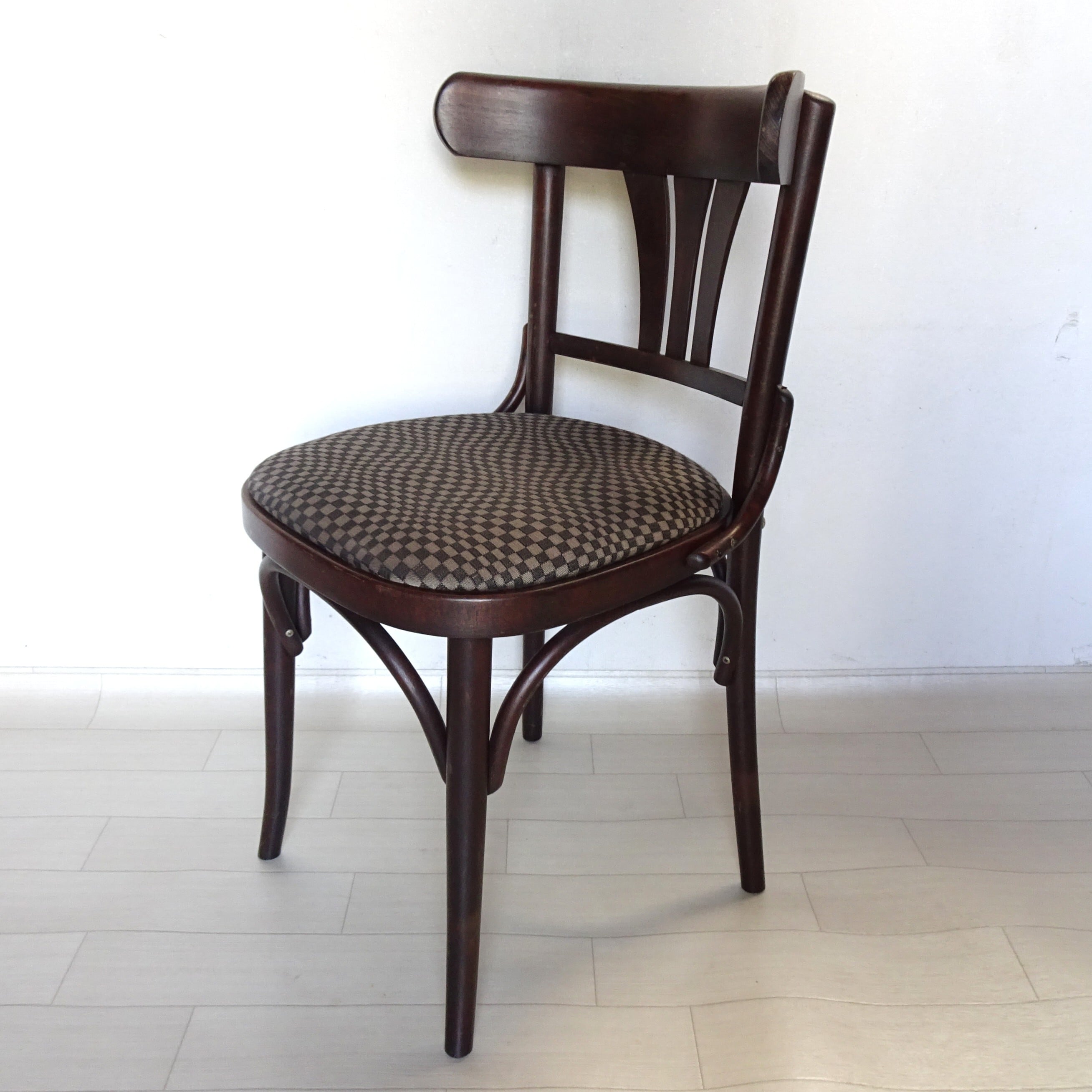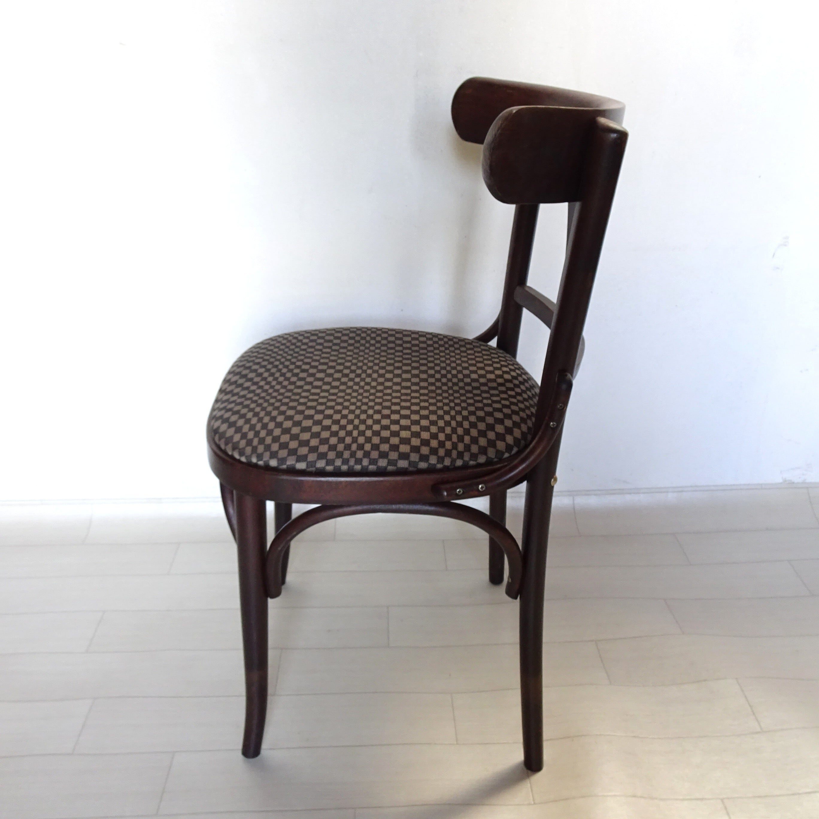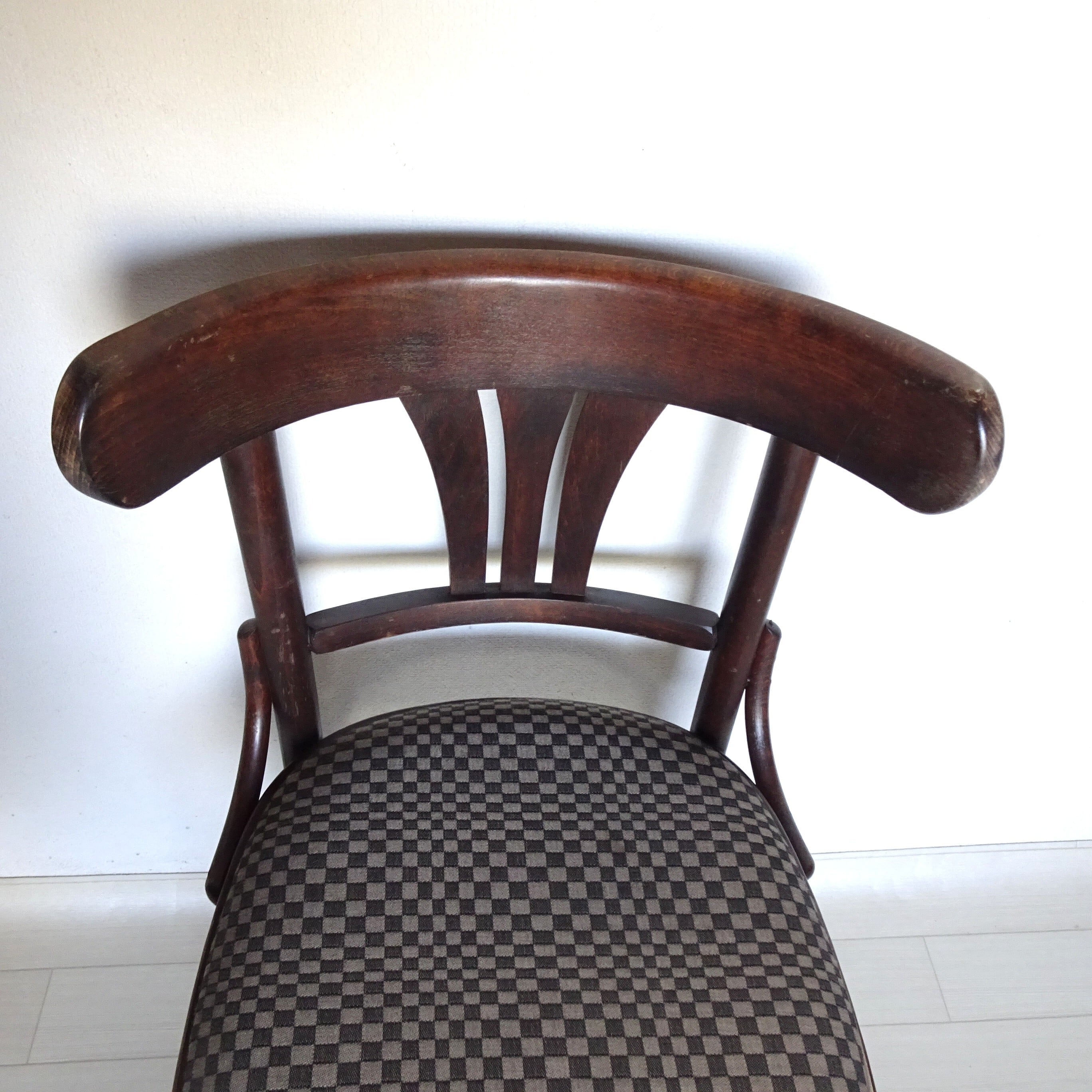 フレームは曲木で、座面はゆがみのある市松模様の布が張られていて、中にはクッションが入っています。