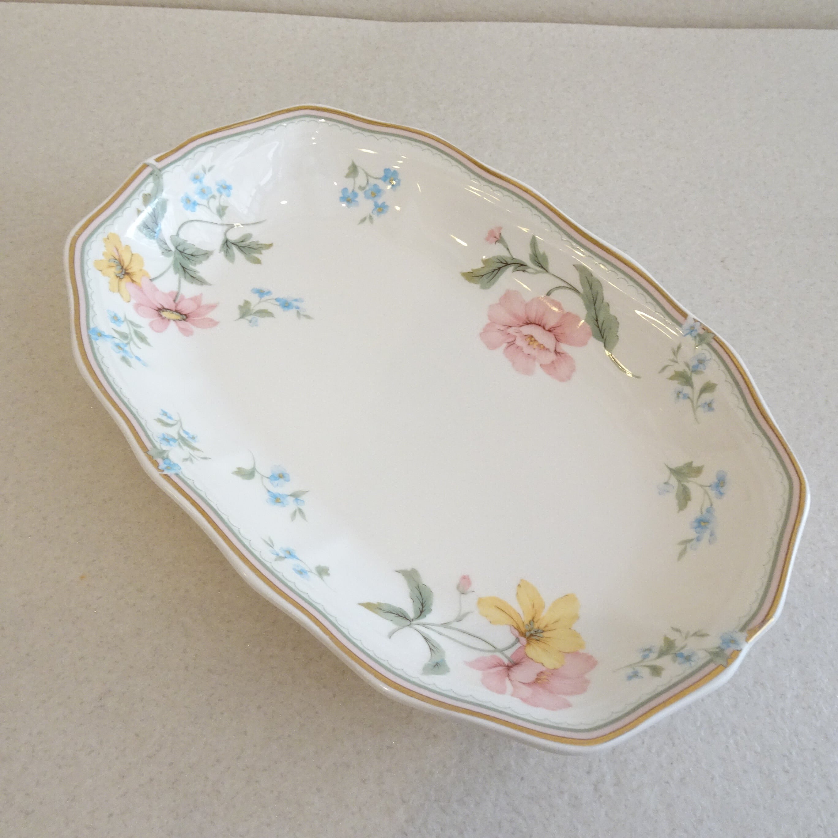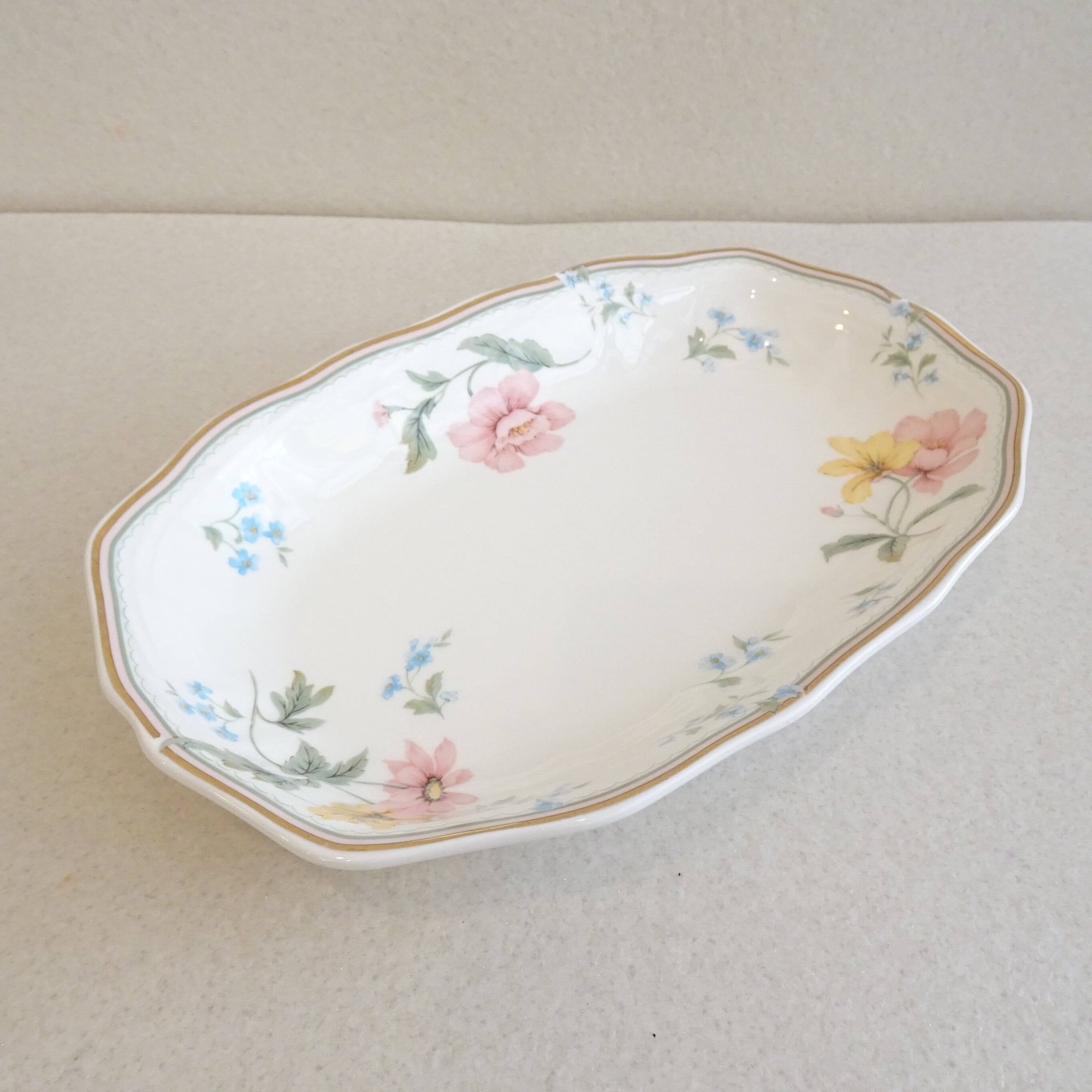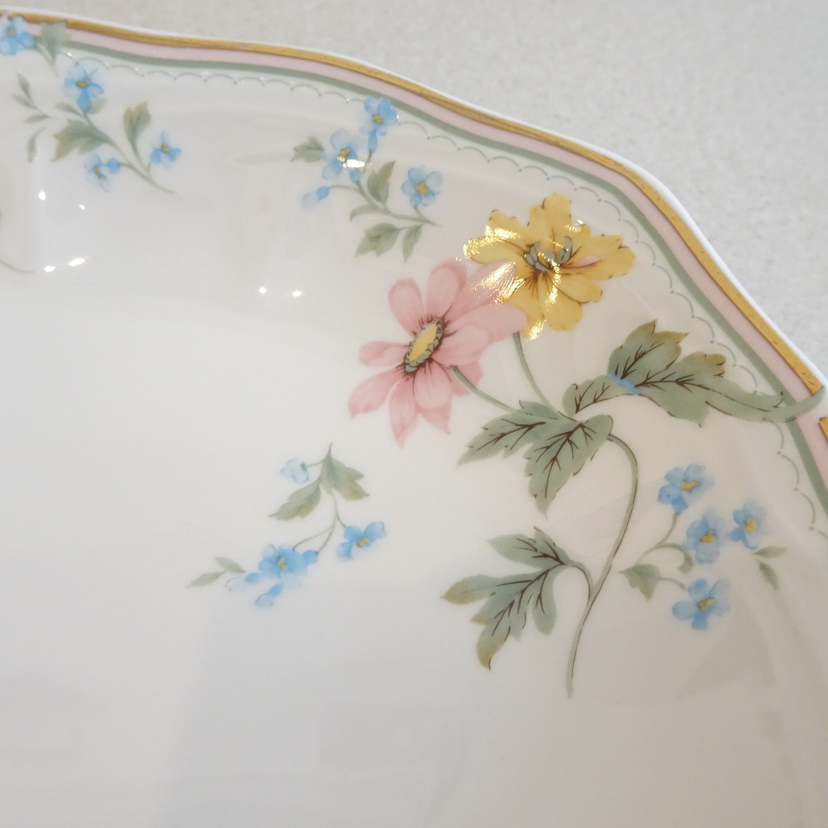 ピンクとイエローの花のほか、ライトブルーのわすれな草がとても素敵なデザインです。フチにはゴールドライン加工があり、かわいらしく上品です。