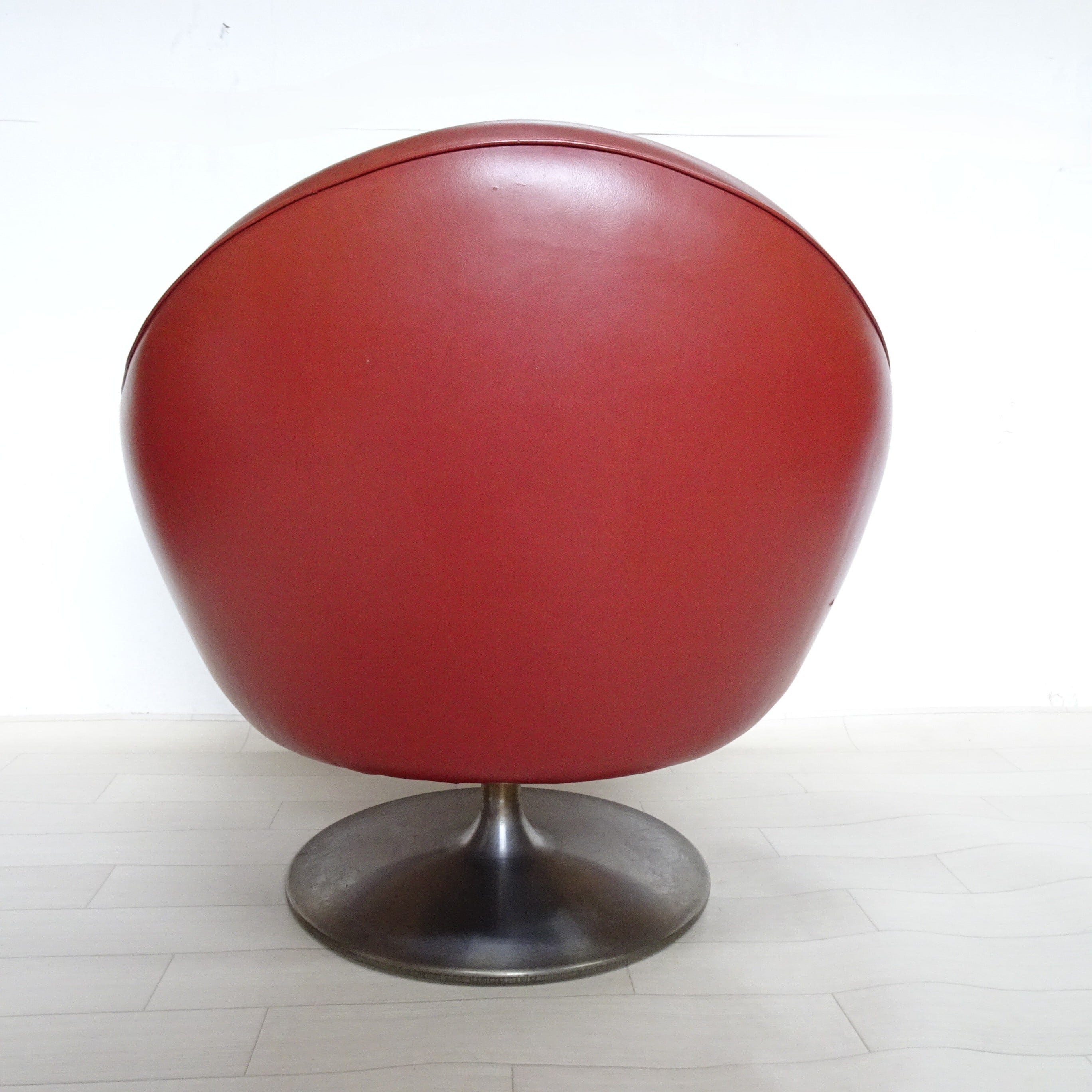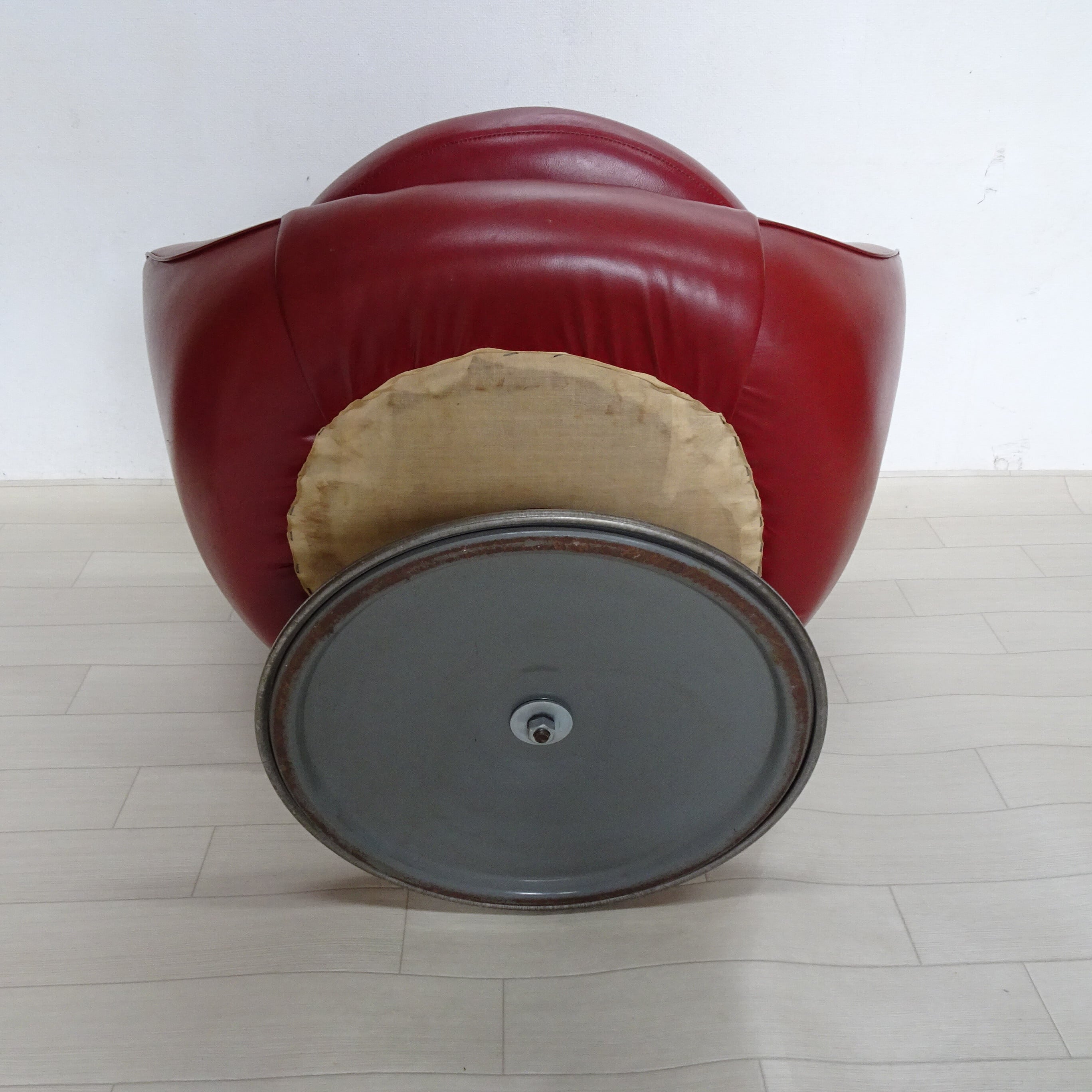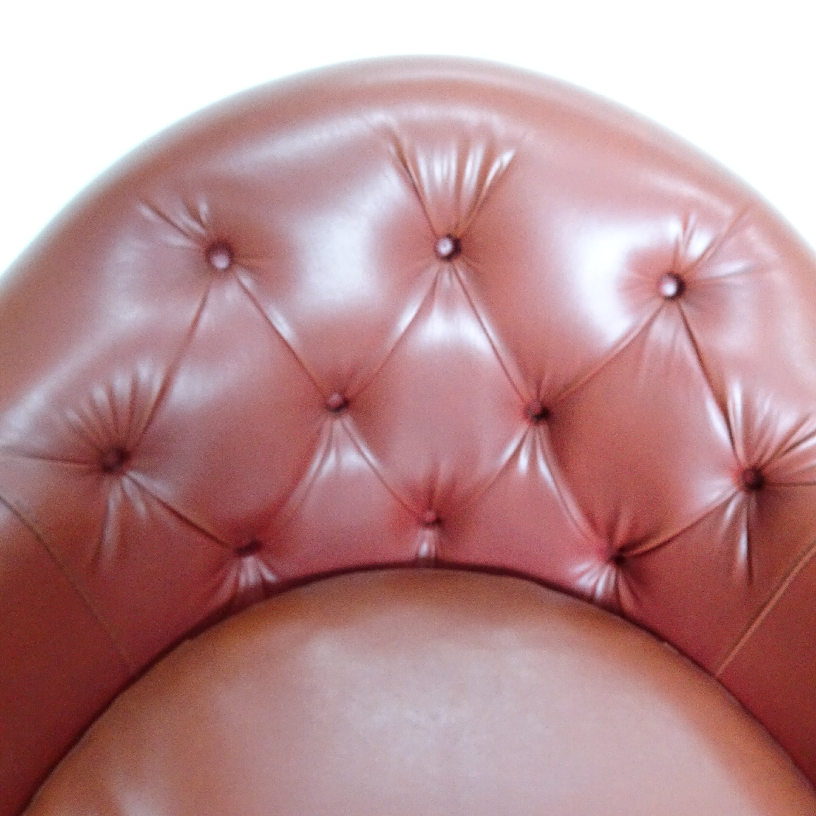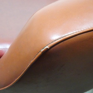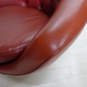 生地はビニールレザーです。日焼けによる色あせが若干あります。下部や裏側など、光が当たりづらい部分は濃い赤に、上部やひじ掛け部分など、光に当たり手が触れる部分は色あせがあります。
