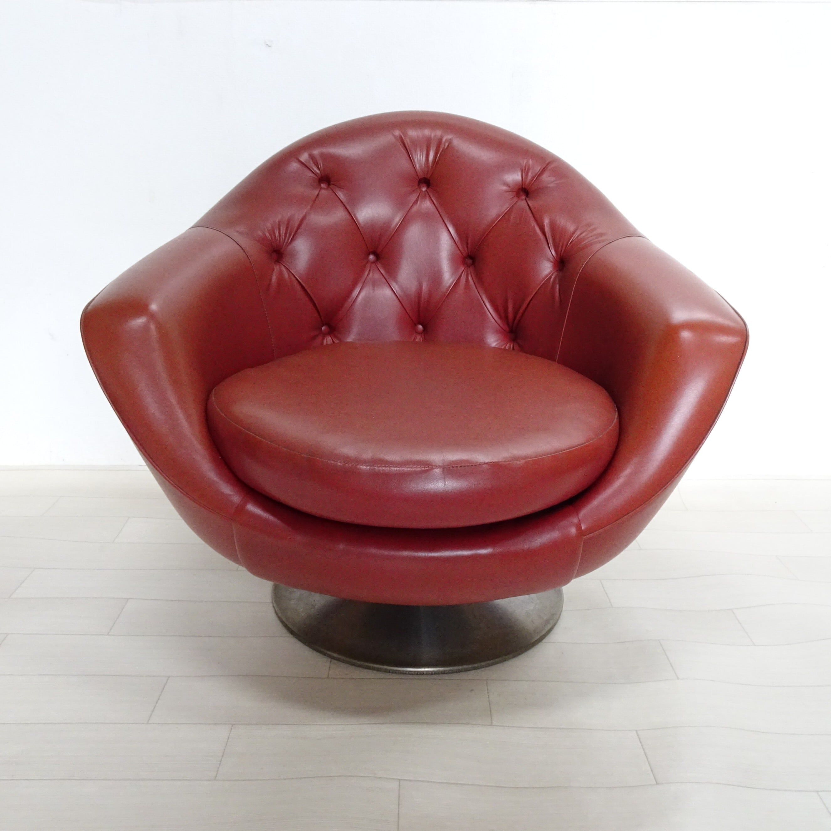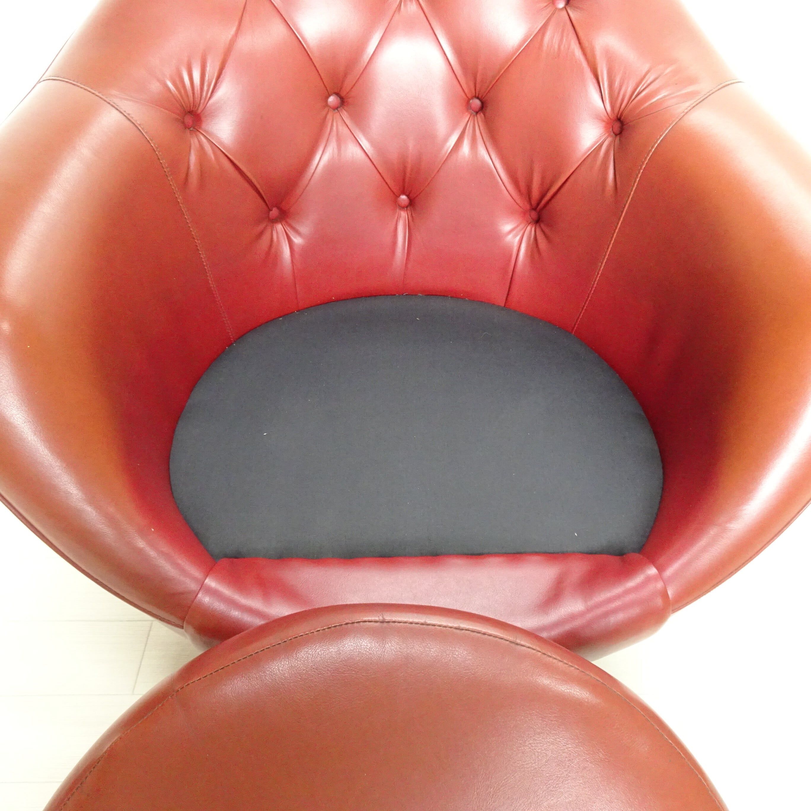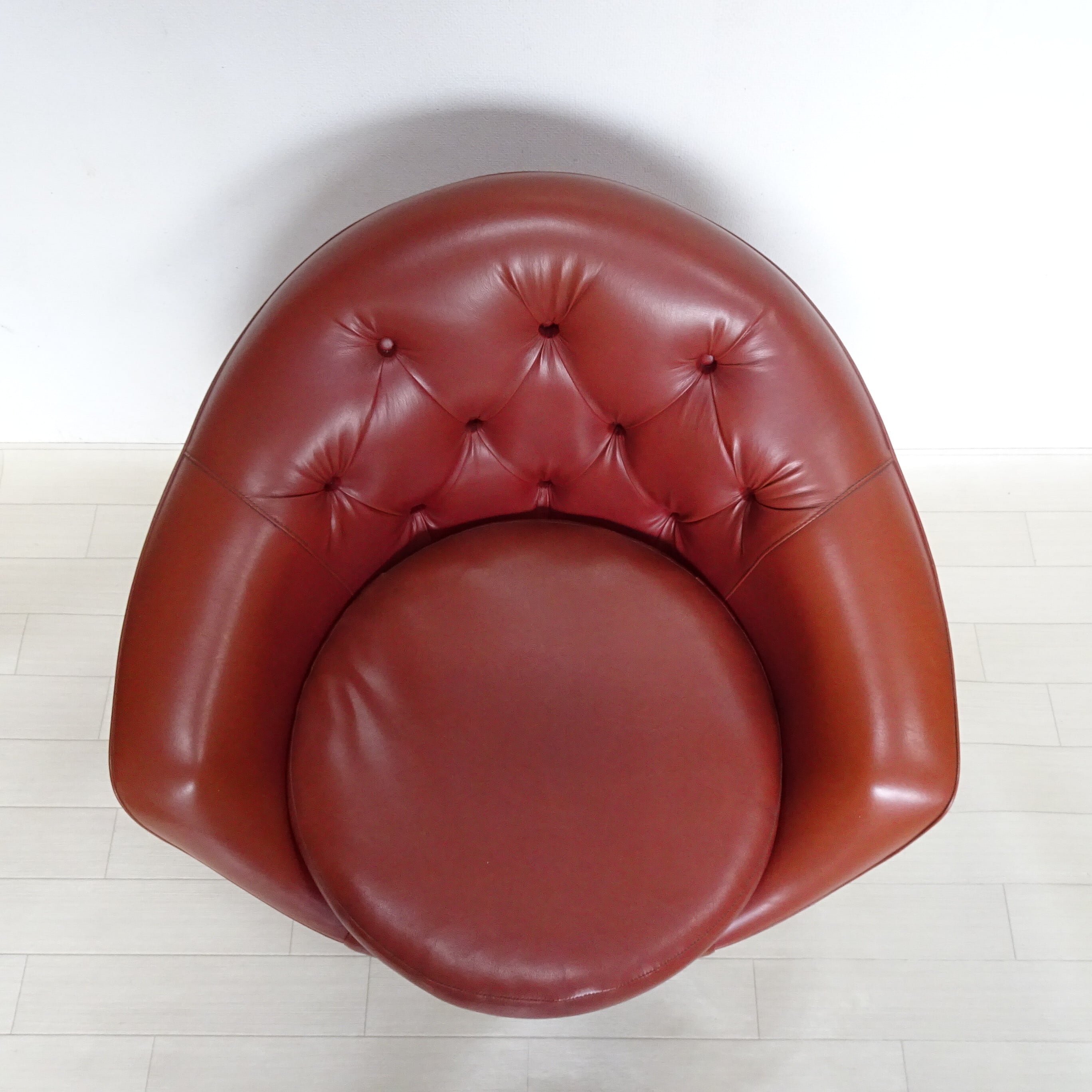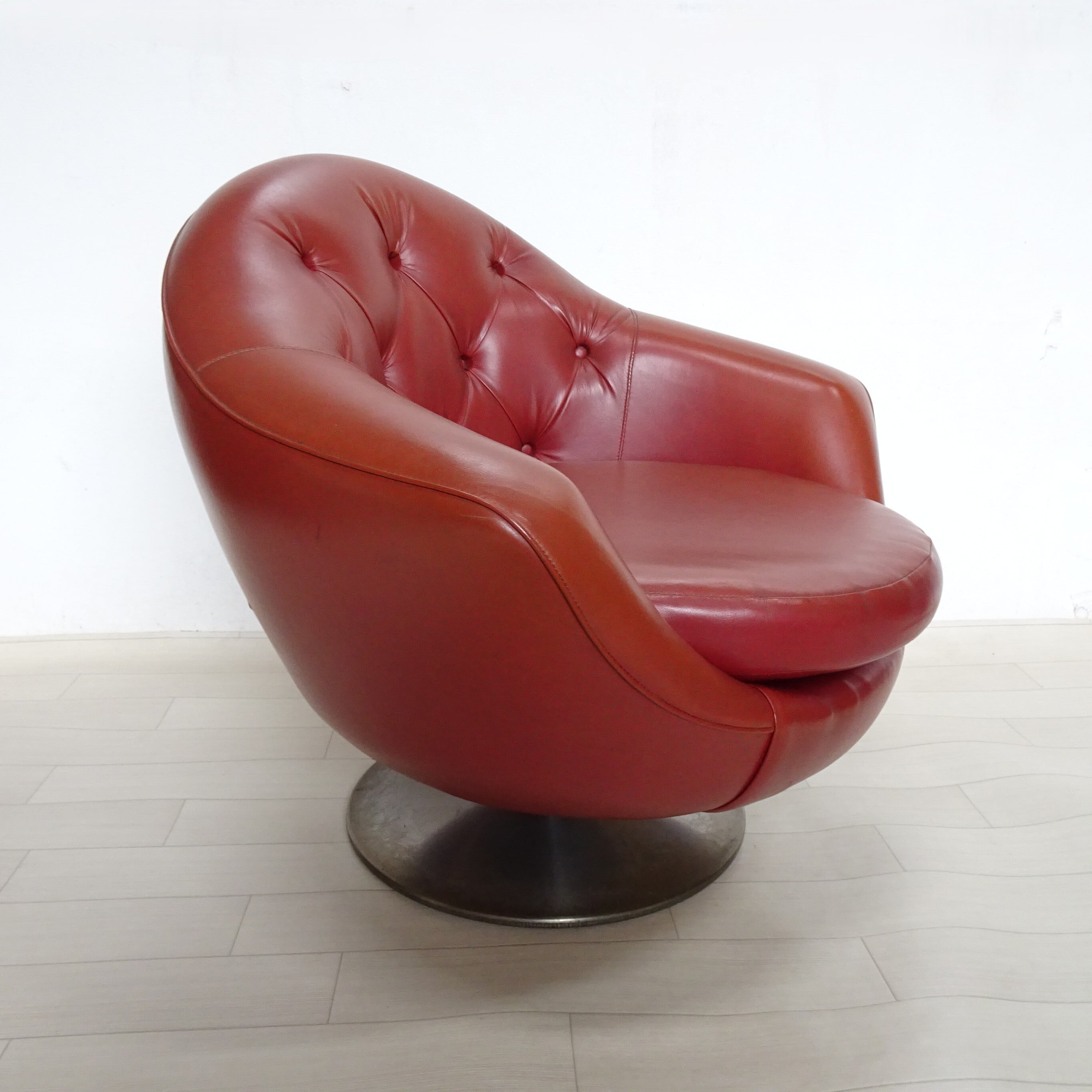 生地はビニールレザーです。日焼けによる色あせが若干あります。下部や裏側など、光が当たりづらい部分は濃い赤に、上部やひじ掛け部分など、光に当たり手が触れる部分は色あせがあります。