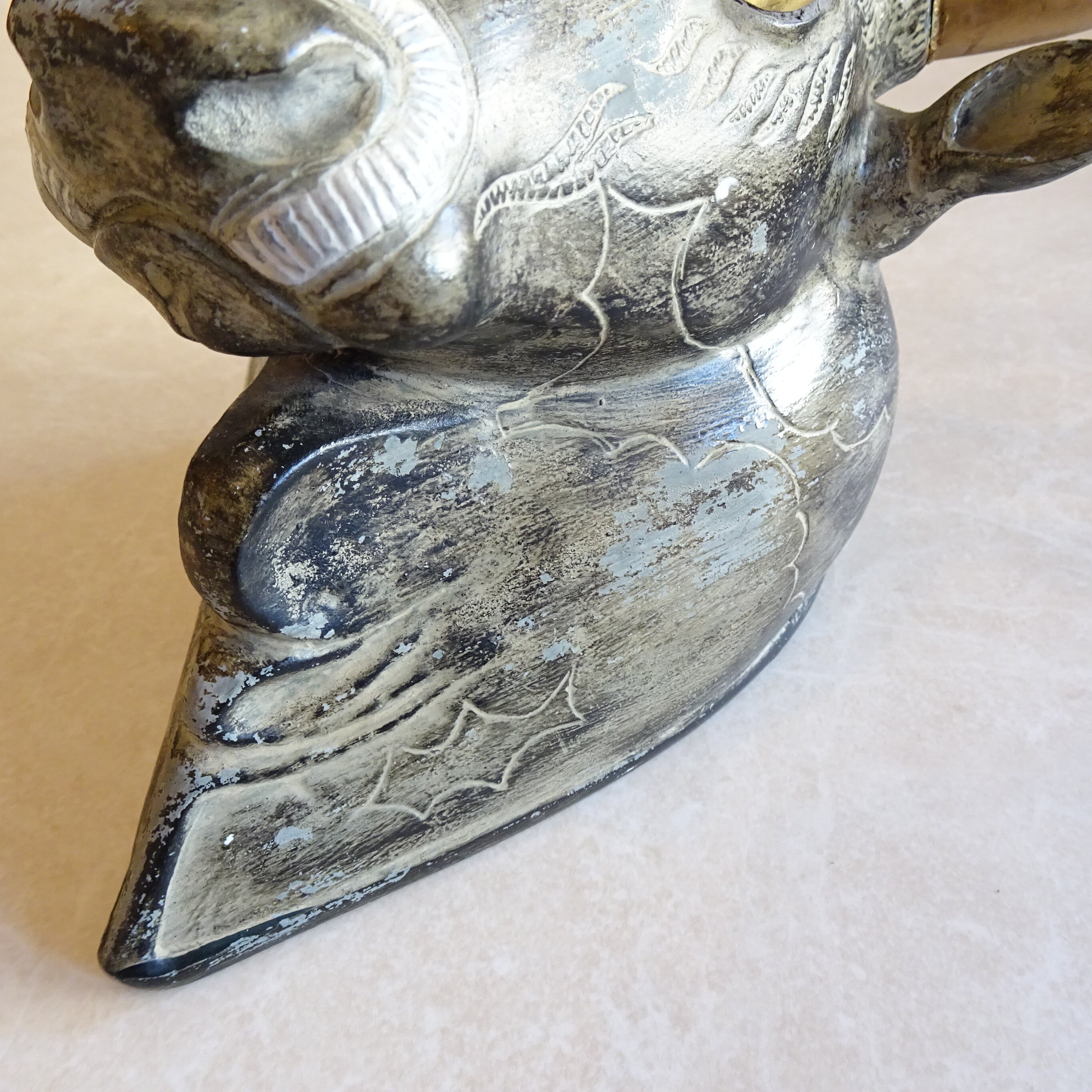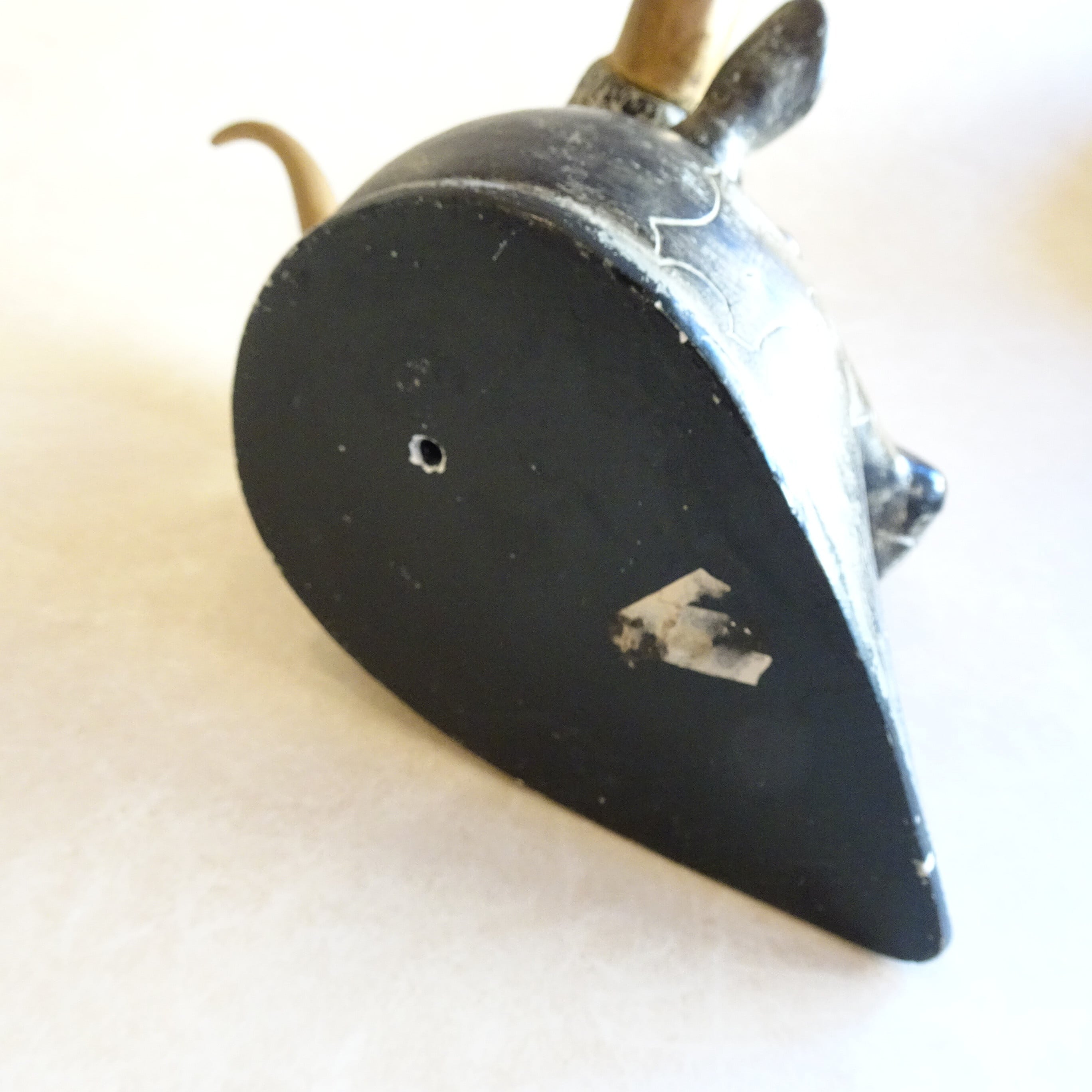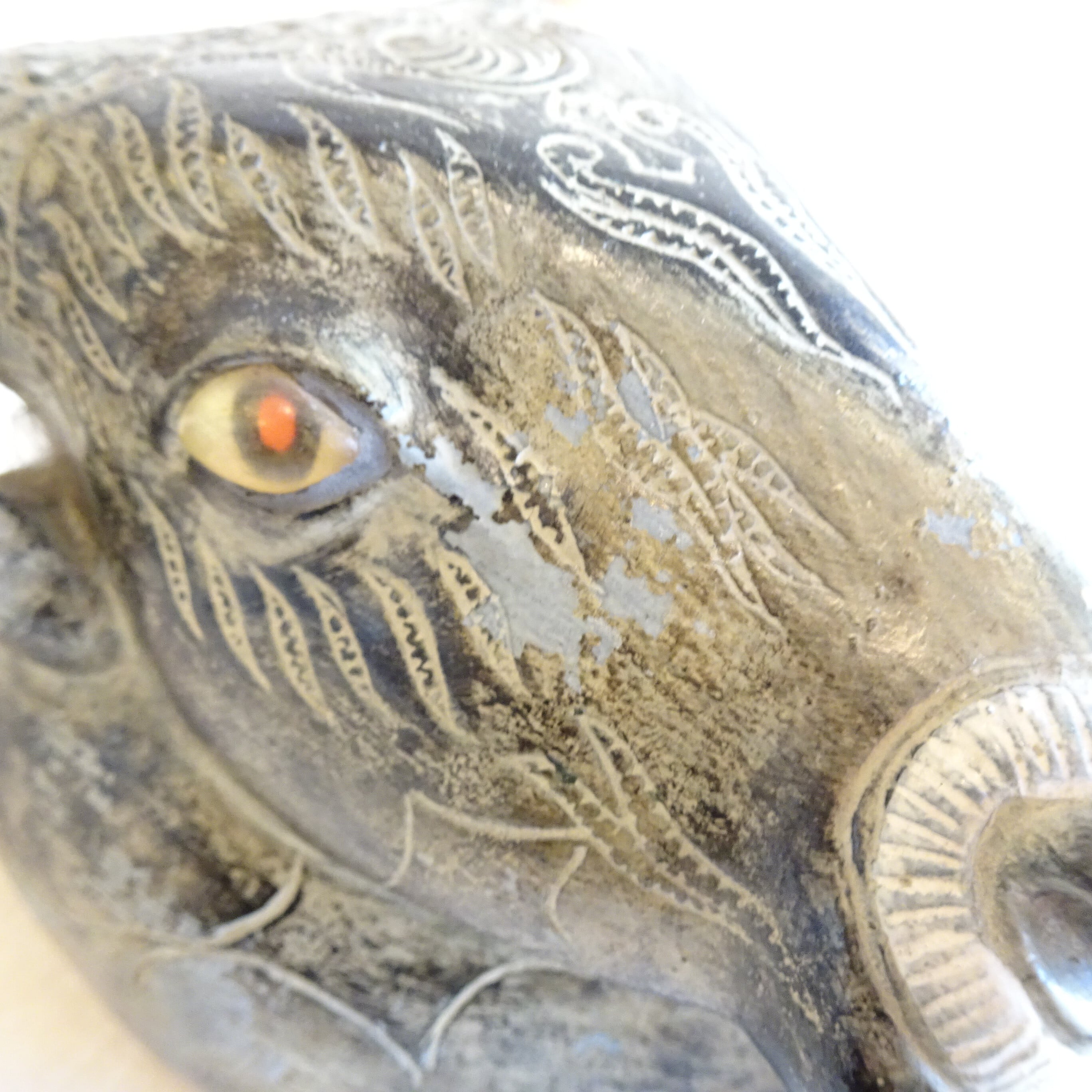 顔全体には装飾的な文様が刻まれています。マットの金色の角がついています。
