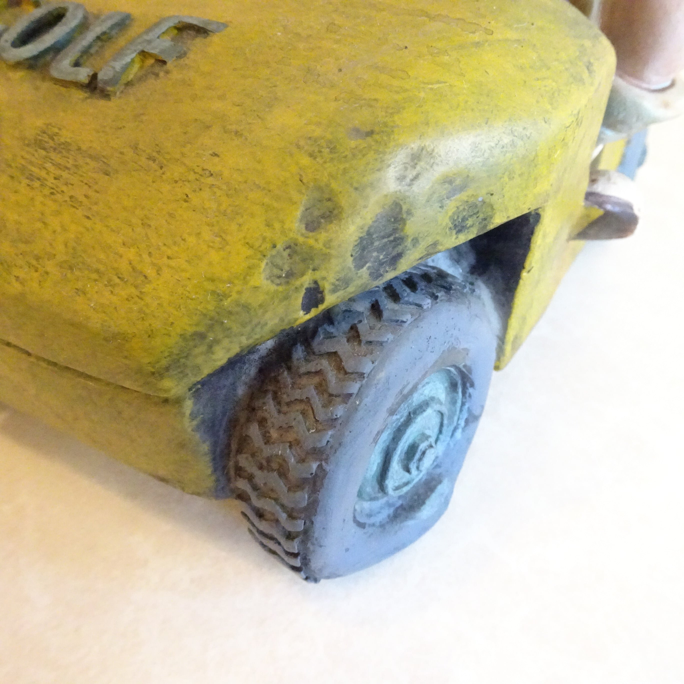 タイヤ自体、表面の凹凸やホイール、留め具など、とても丁寧に作られています。ほかにもゴルフバッグのステッチや、男性が着ているセーターの毛糸の網目、車のシート(座席)の細かい質感まで、細部にわたって精緻に作り込まれているのもとても面白いです。