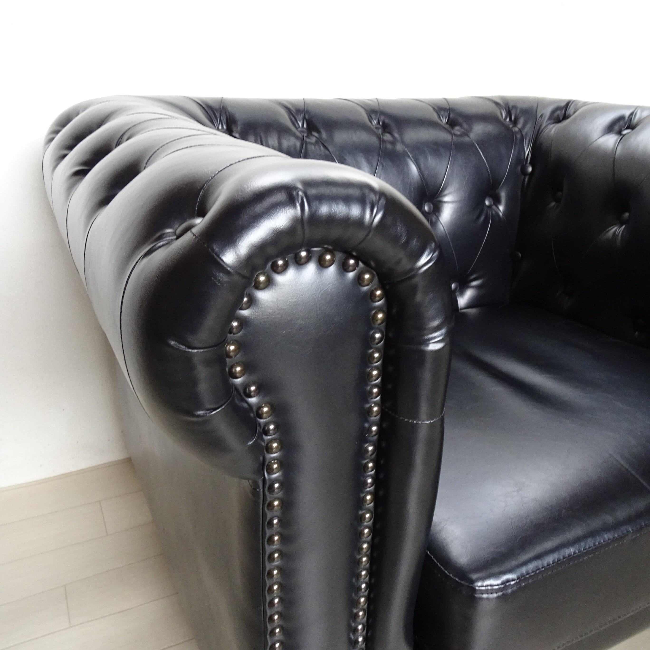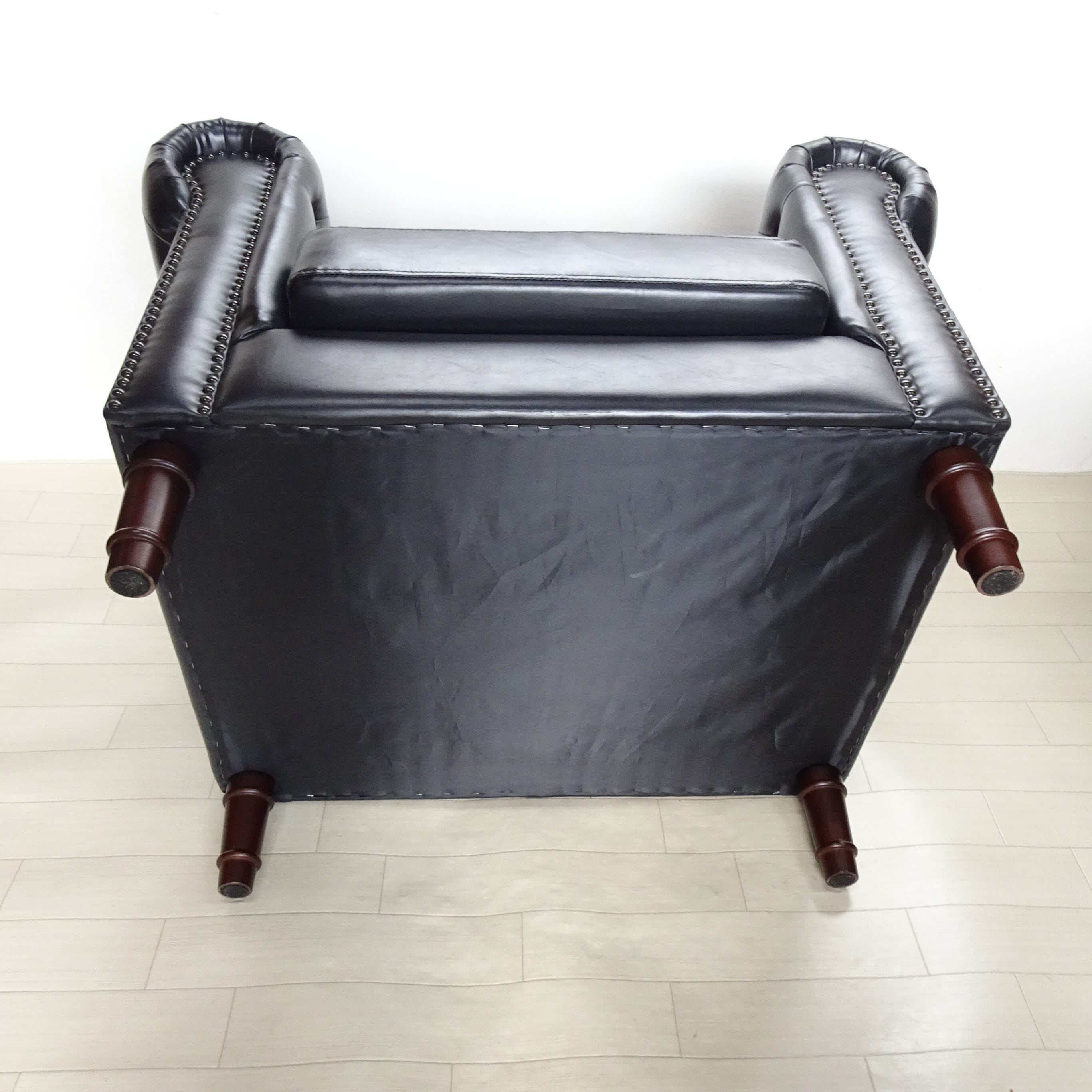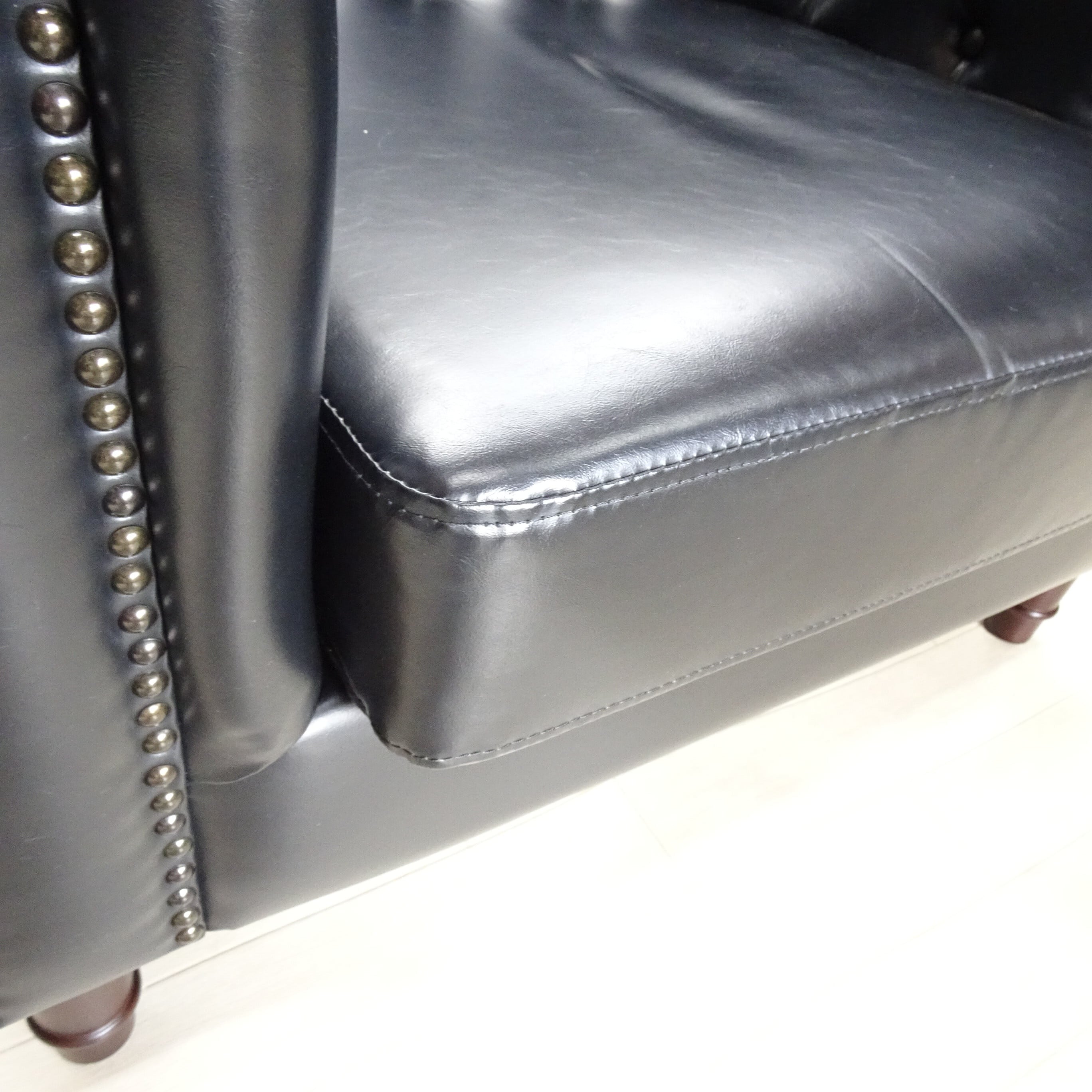 全面の鋲打ちの装飾が目を惹き、ボックス型でずっしりと存在感のあるソファーです。
