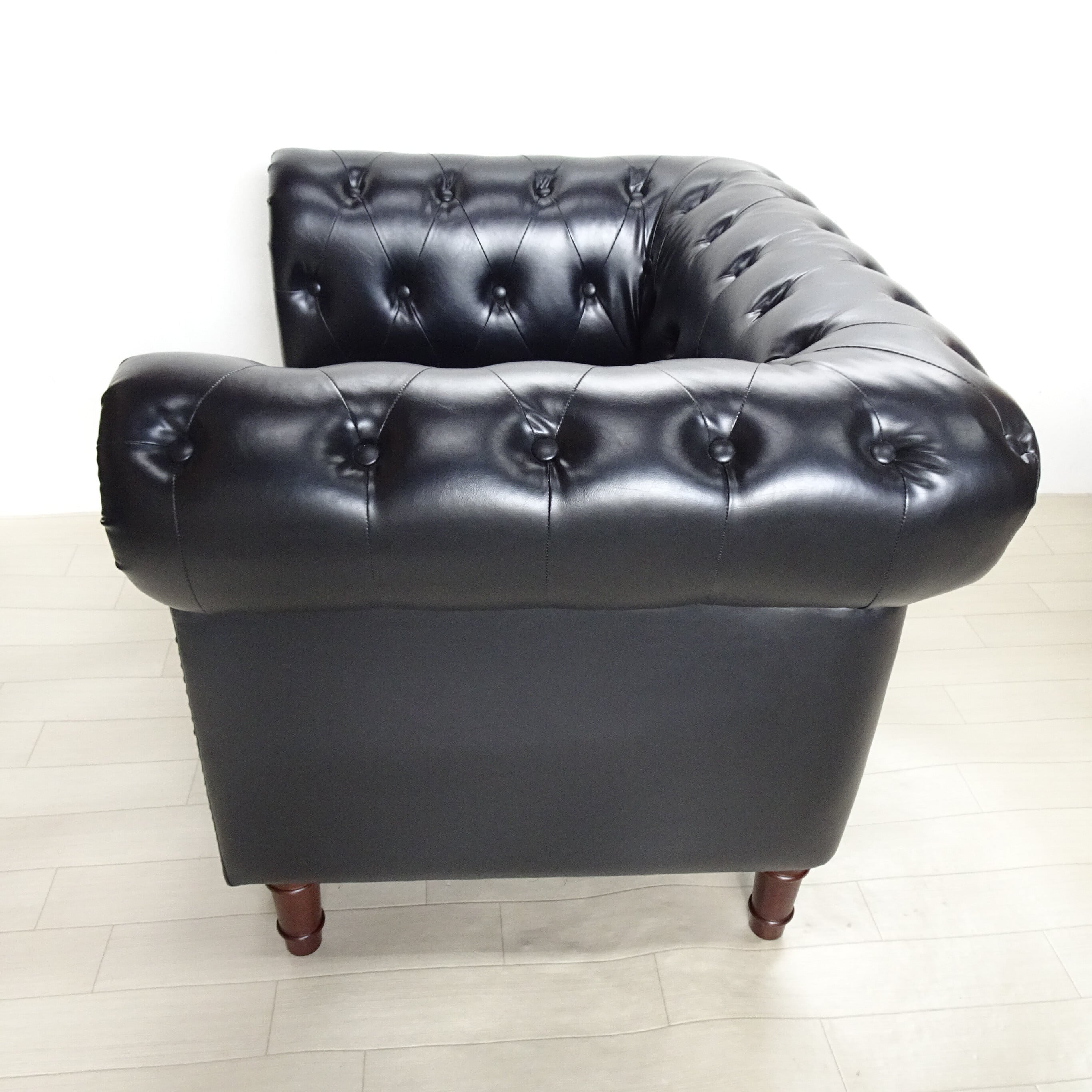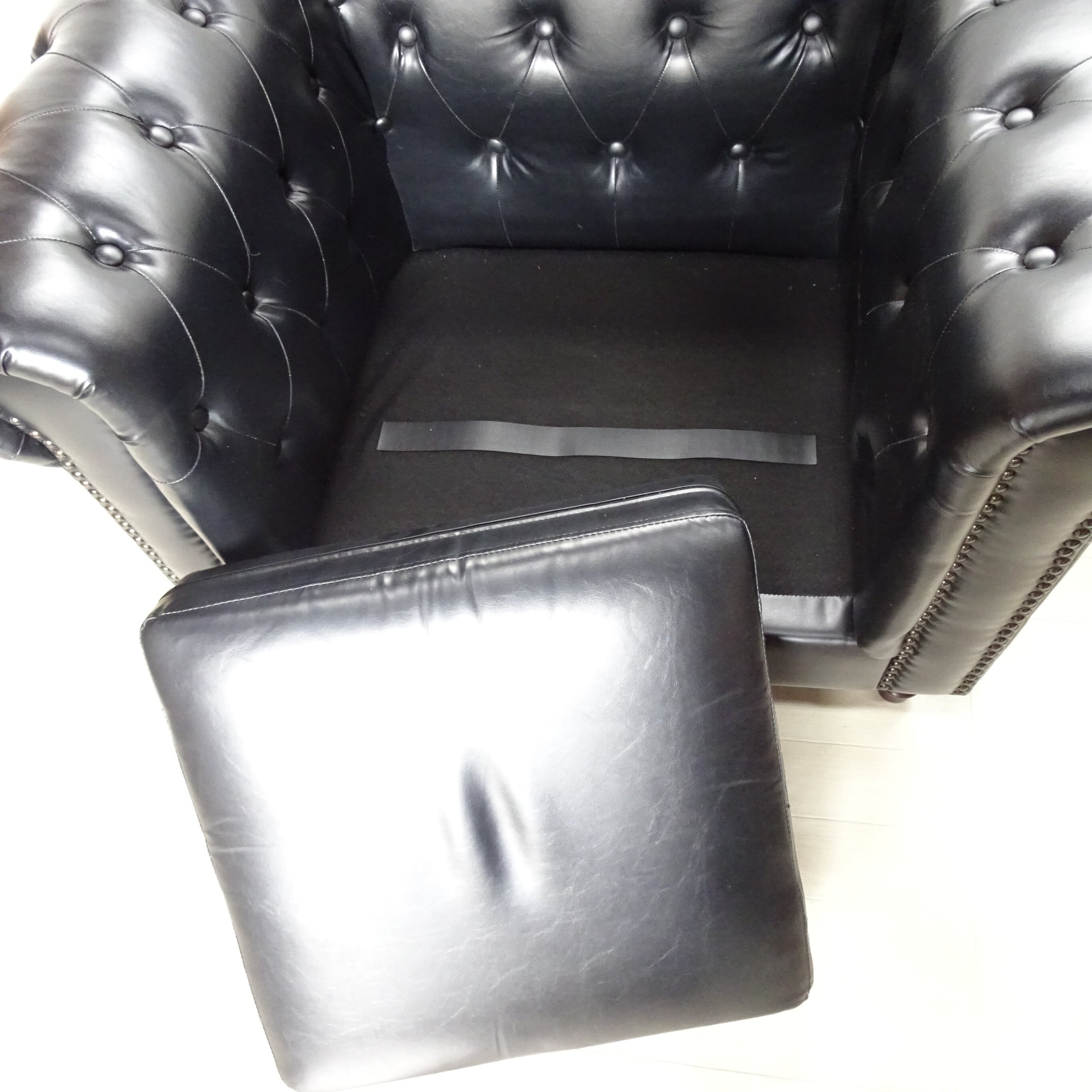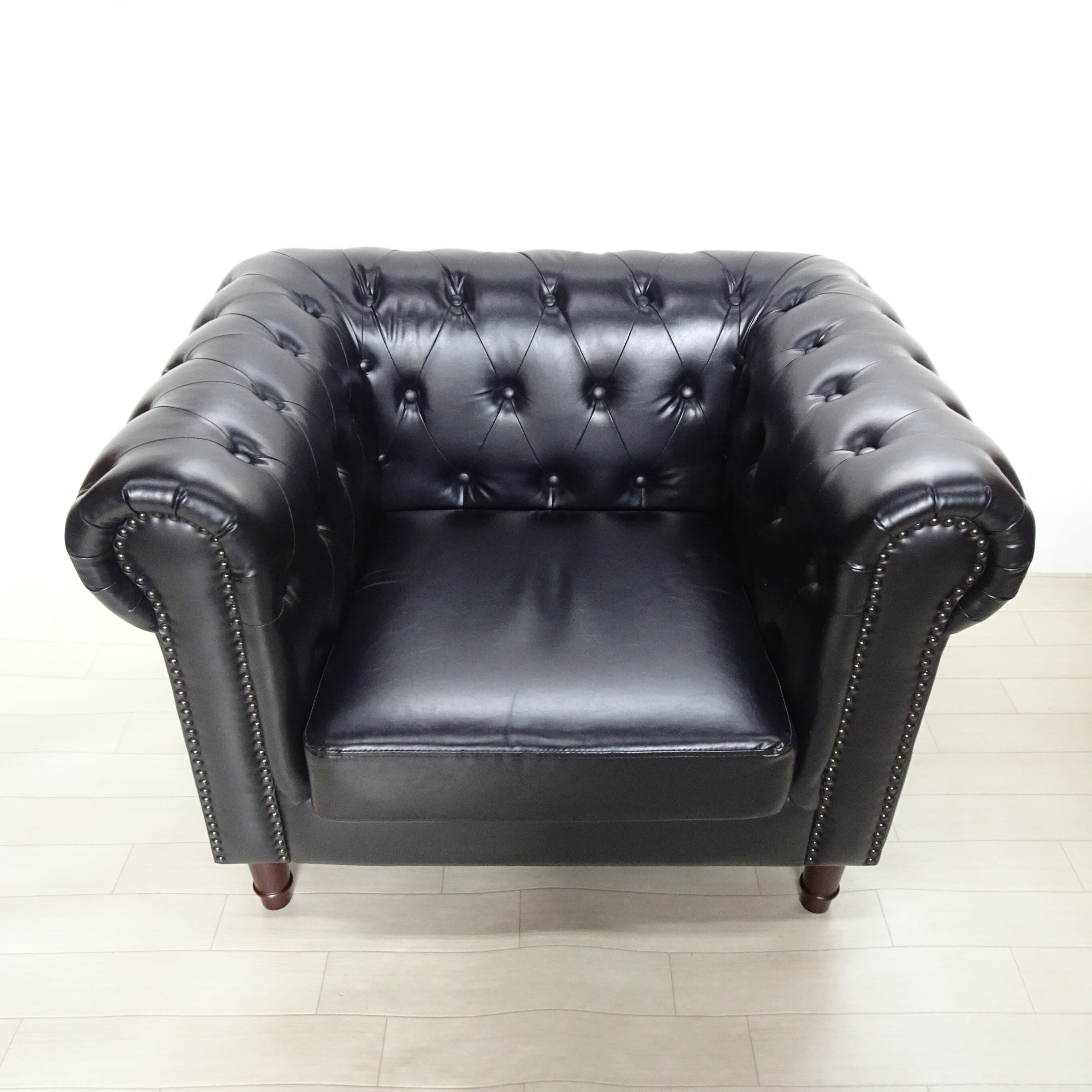 全面の鋲打ちの装飾が目を惹き、ボックス型でずっしりと存在感のあるソファーです。