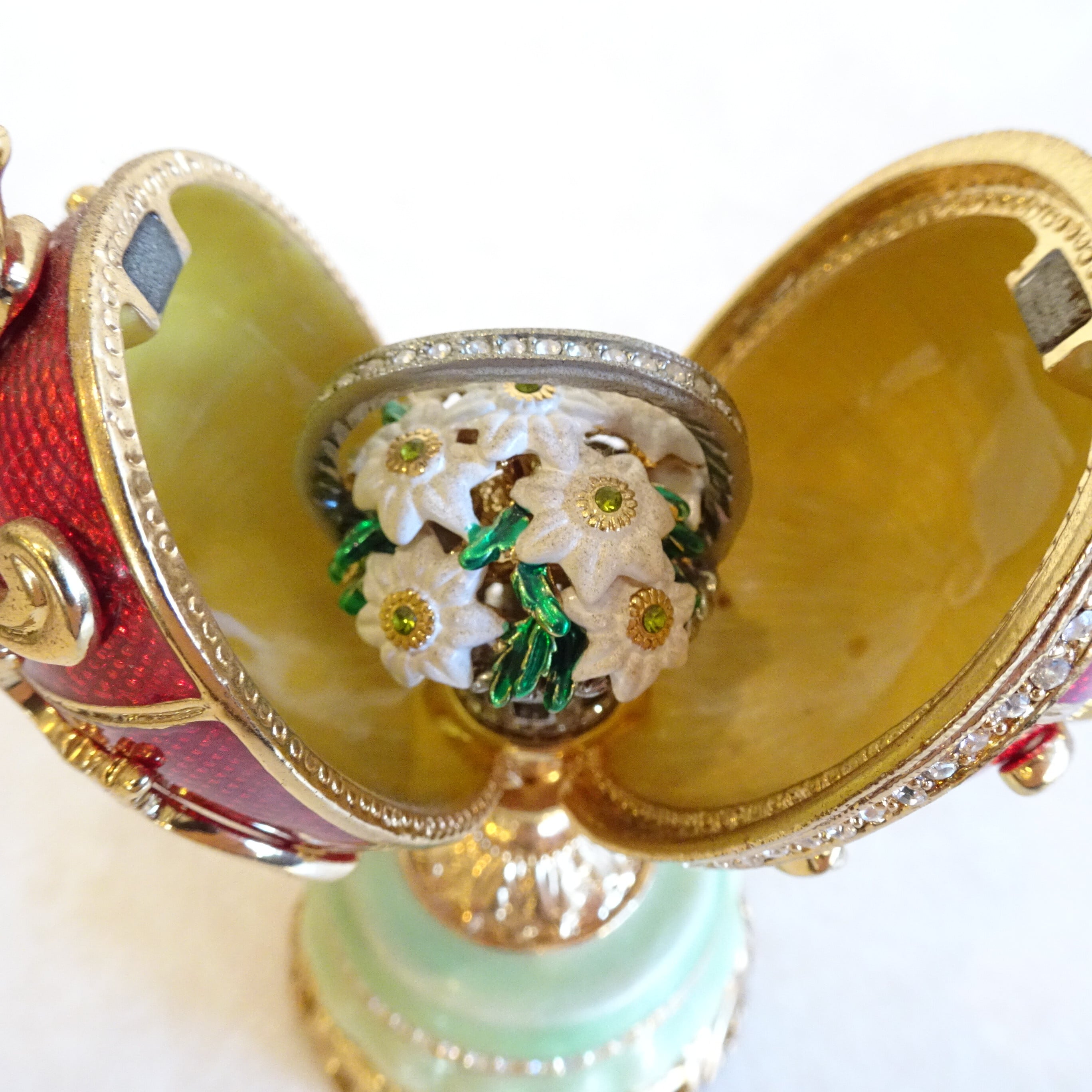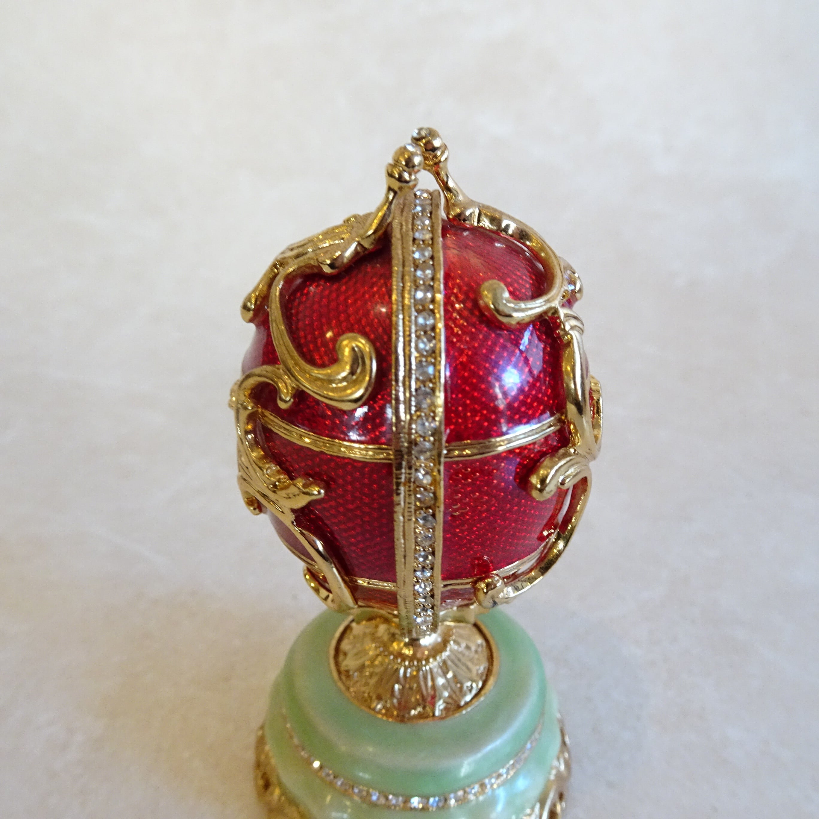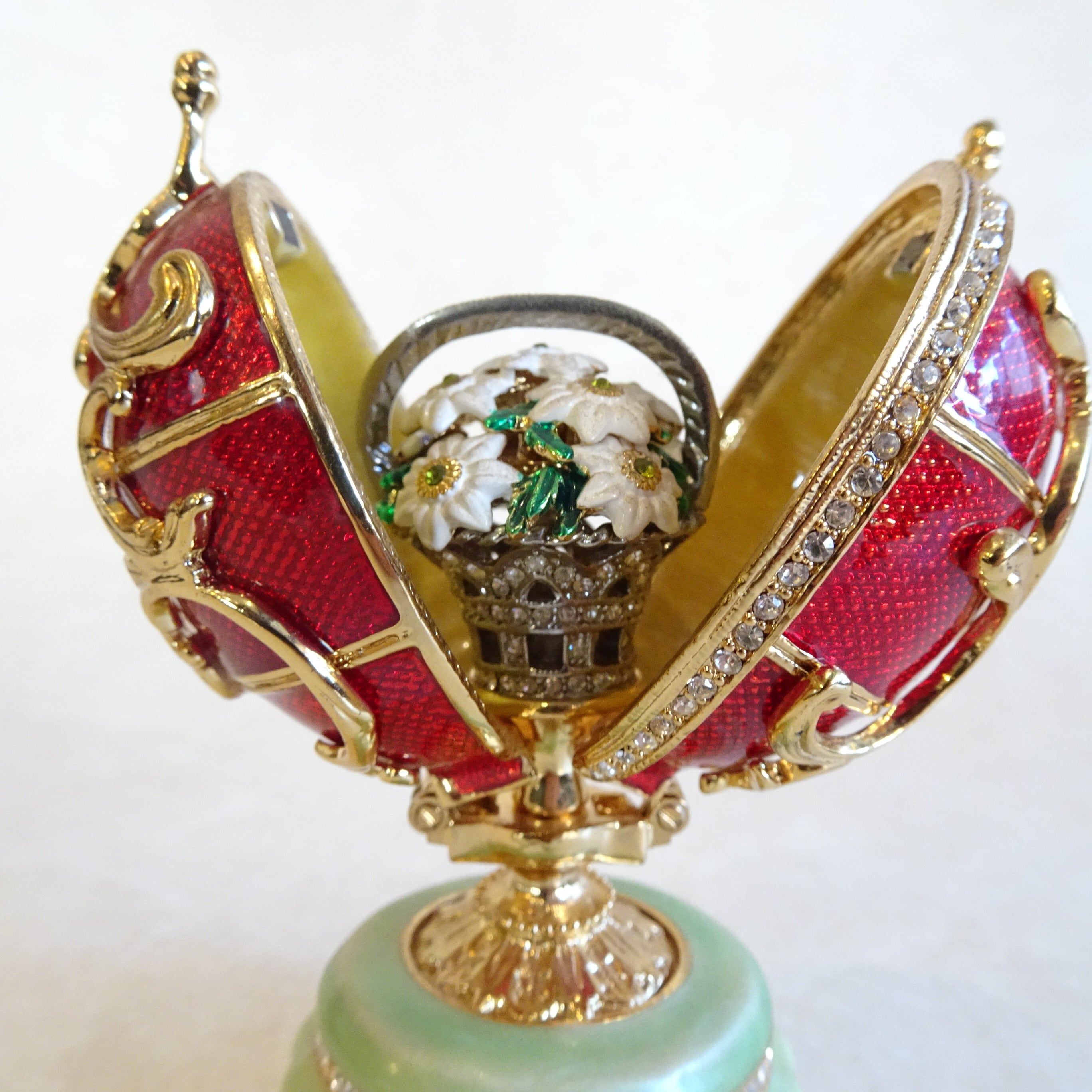 ロシアのロマノフ朝時代につくられたインペリアルイースターエッグがモチーフになっています。赤いエッグは縦に開くようになっており、開けるとエーデルワイスのようなお花のフラワーバスケットが現れます。