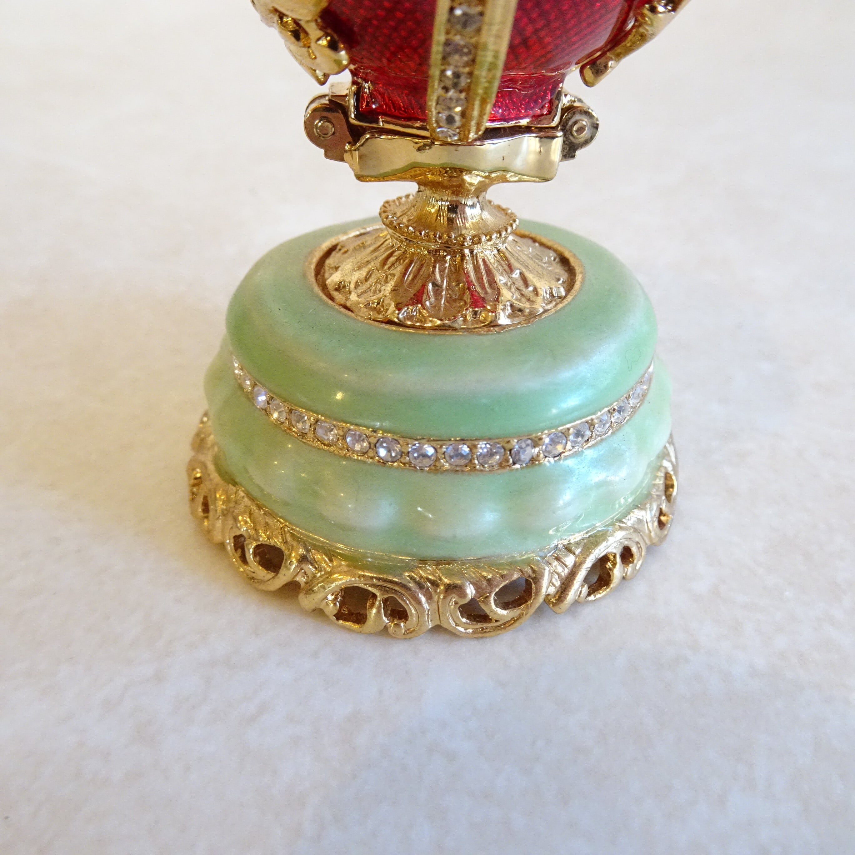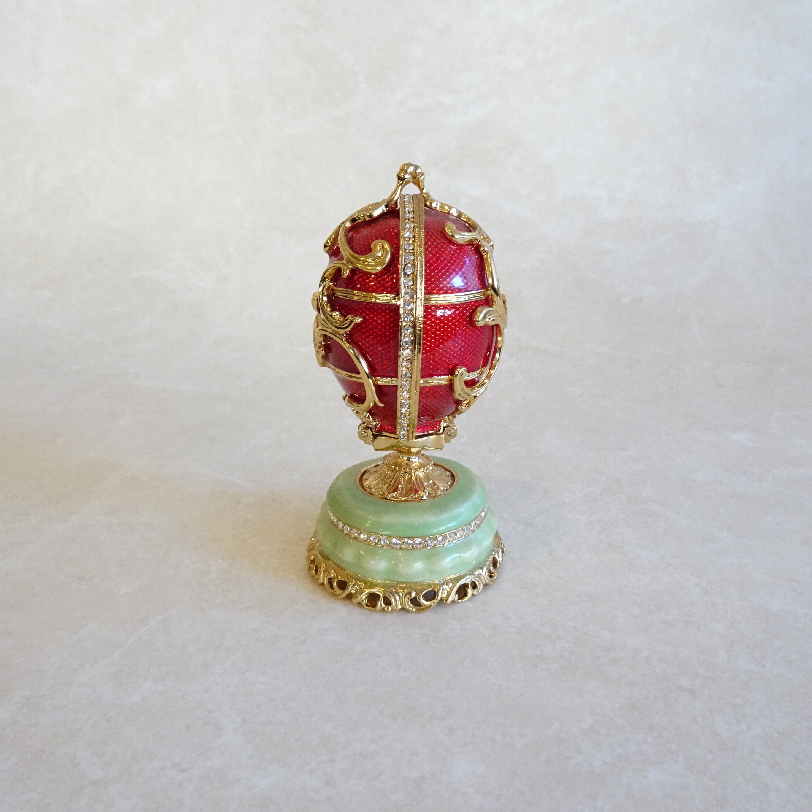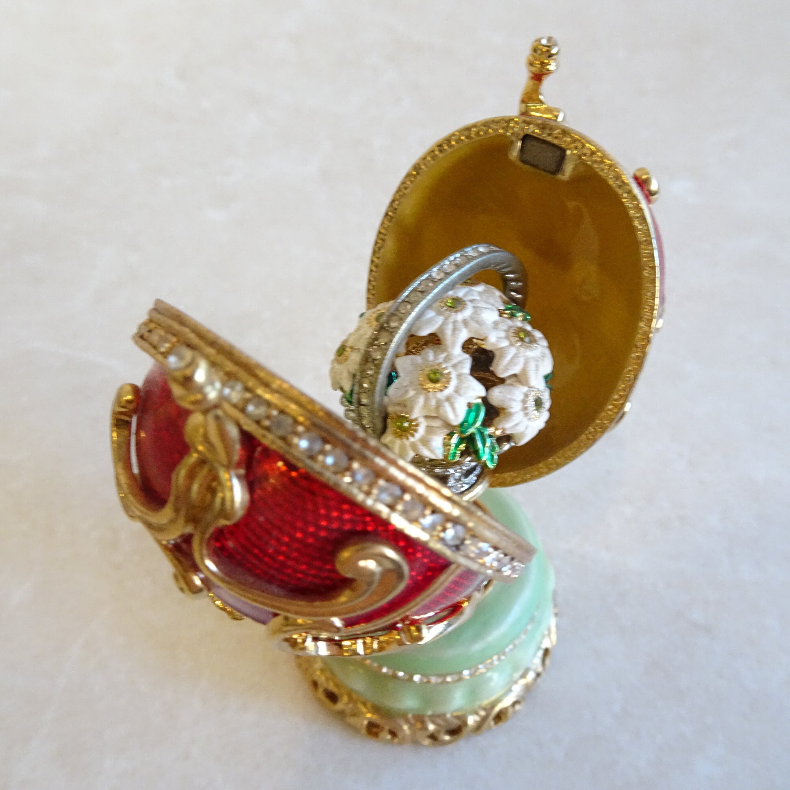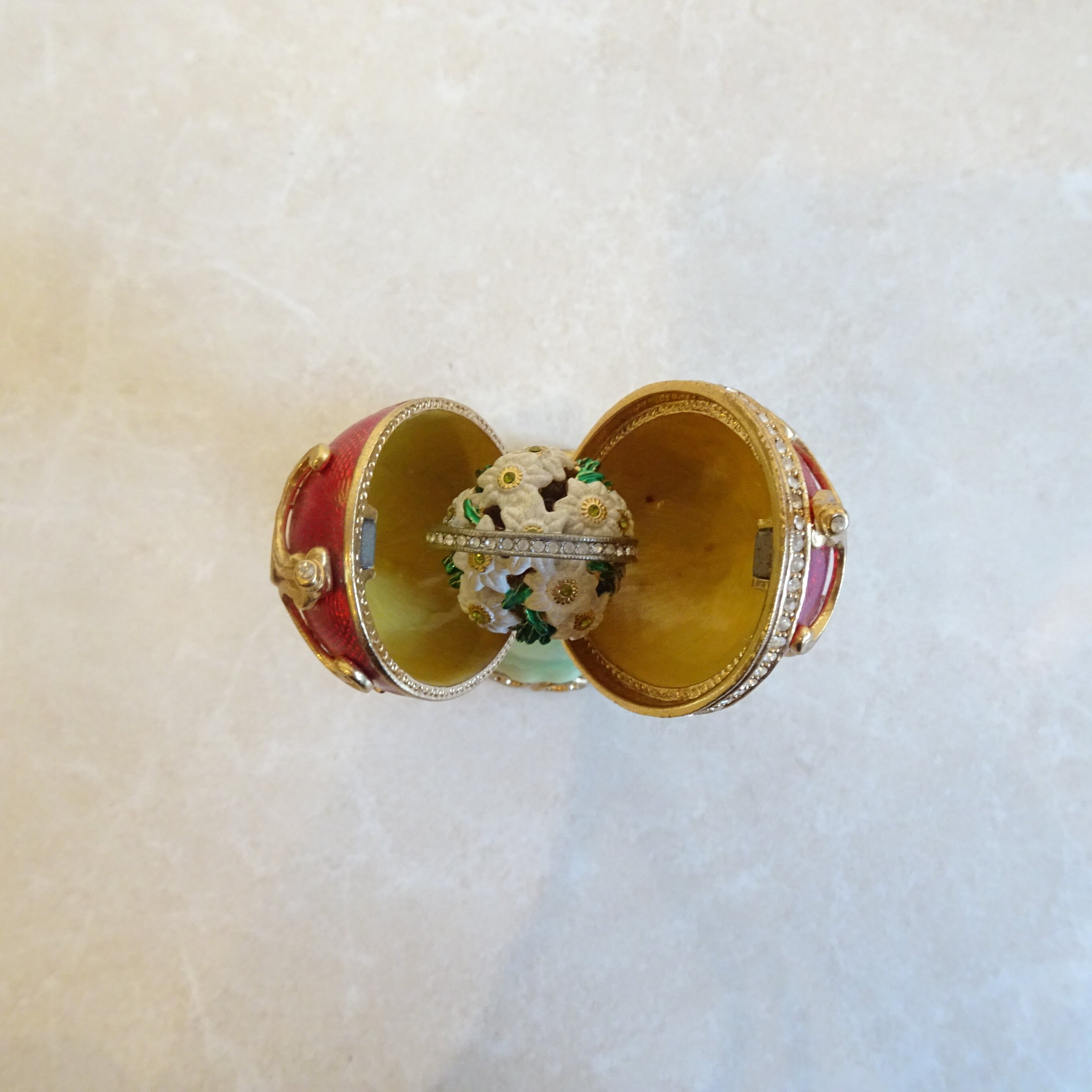 ロシアのロマノフ朝時代につくられたインペリアルイースターエッグがモチーフになっています。赤いエッグは縦に開くようになっており、開けるとエーデルワイスのようなお花のフラワーバスケットが現れます。