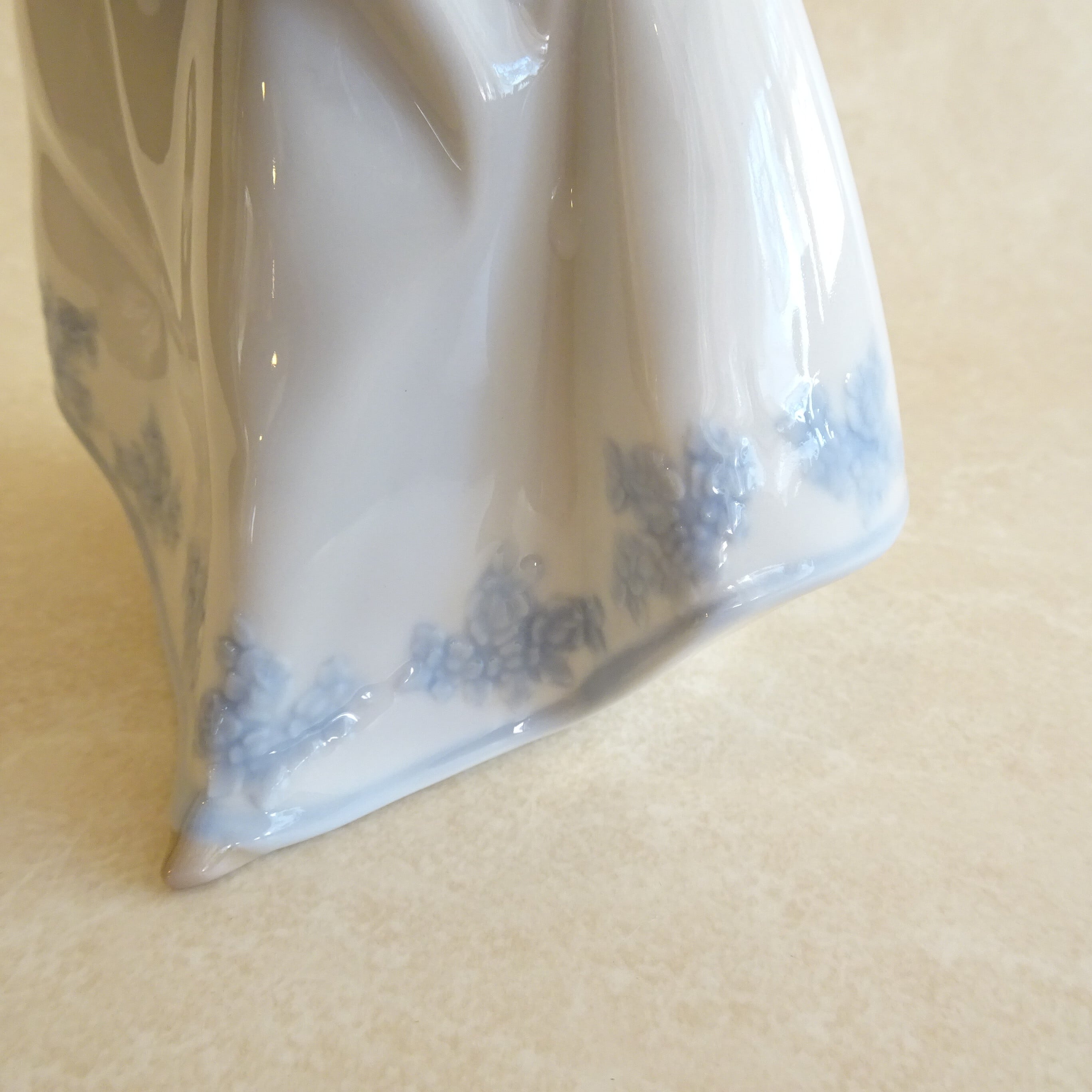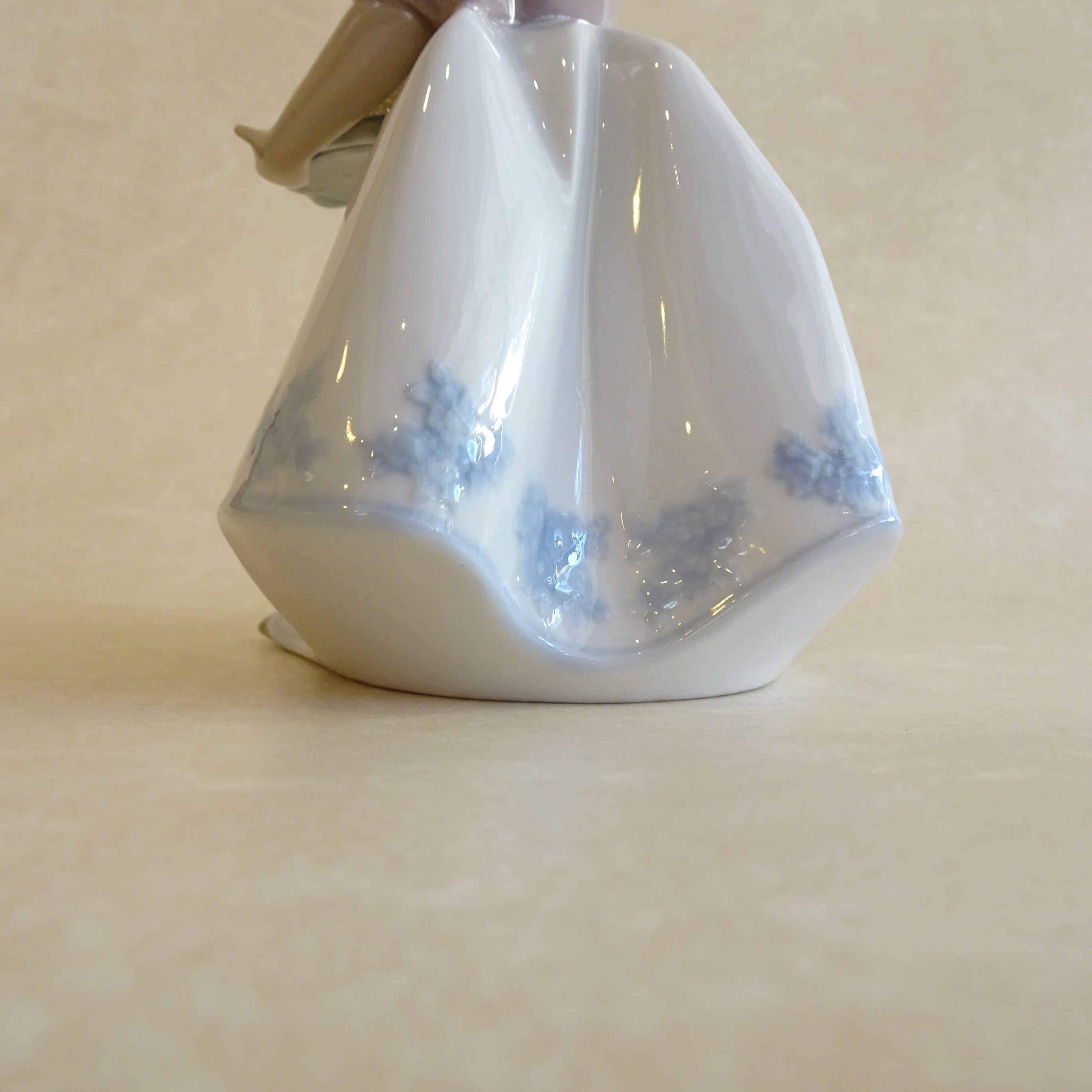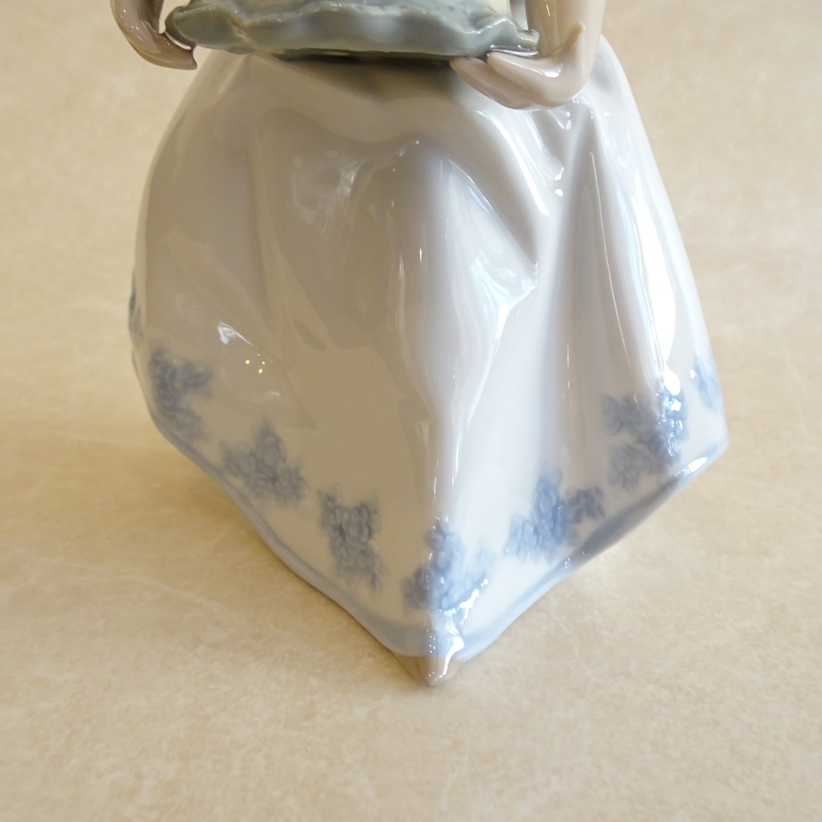 スカートの淡いブルーのバラの刺繍模様がうつくしく、手指の先までとてもよくつくられています。リヤドロならではの、なめらかな陶器の質感と、やさしい色合いがたのしめるフィギュリンです。