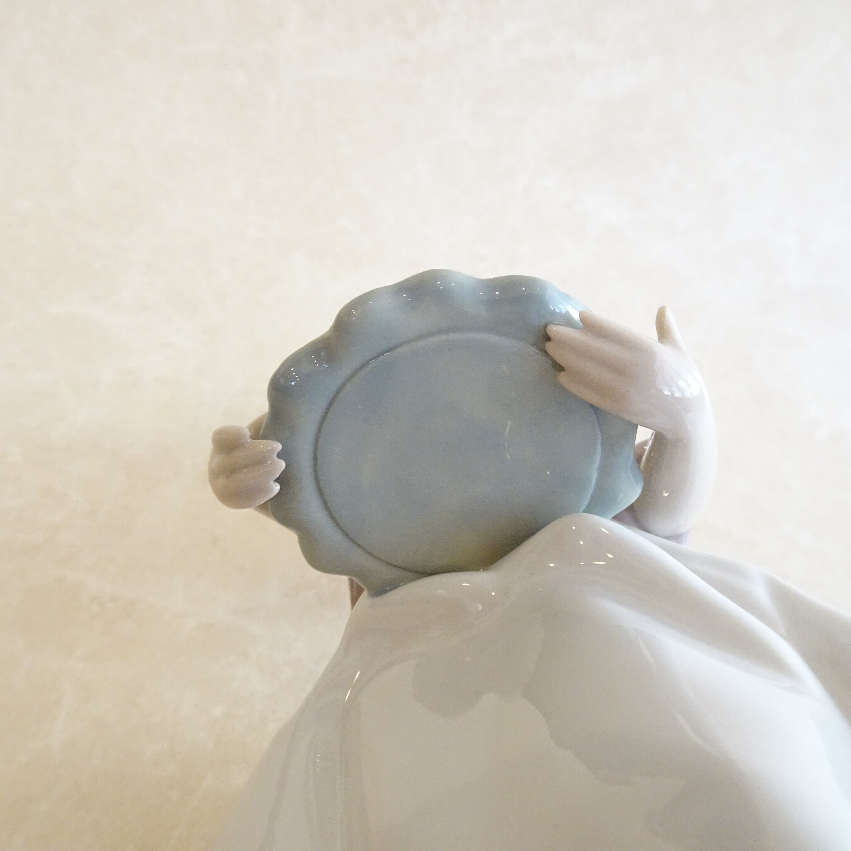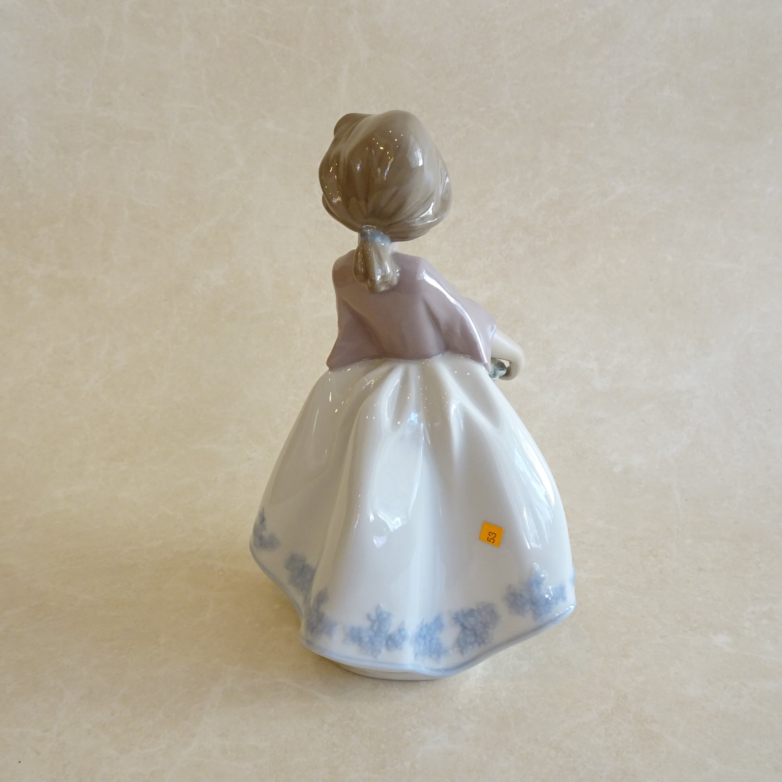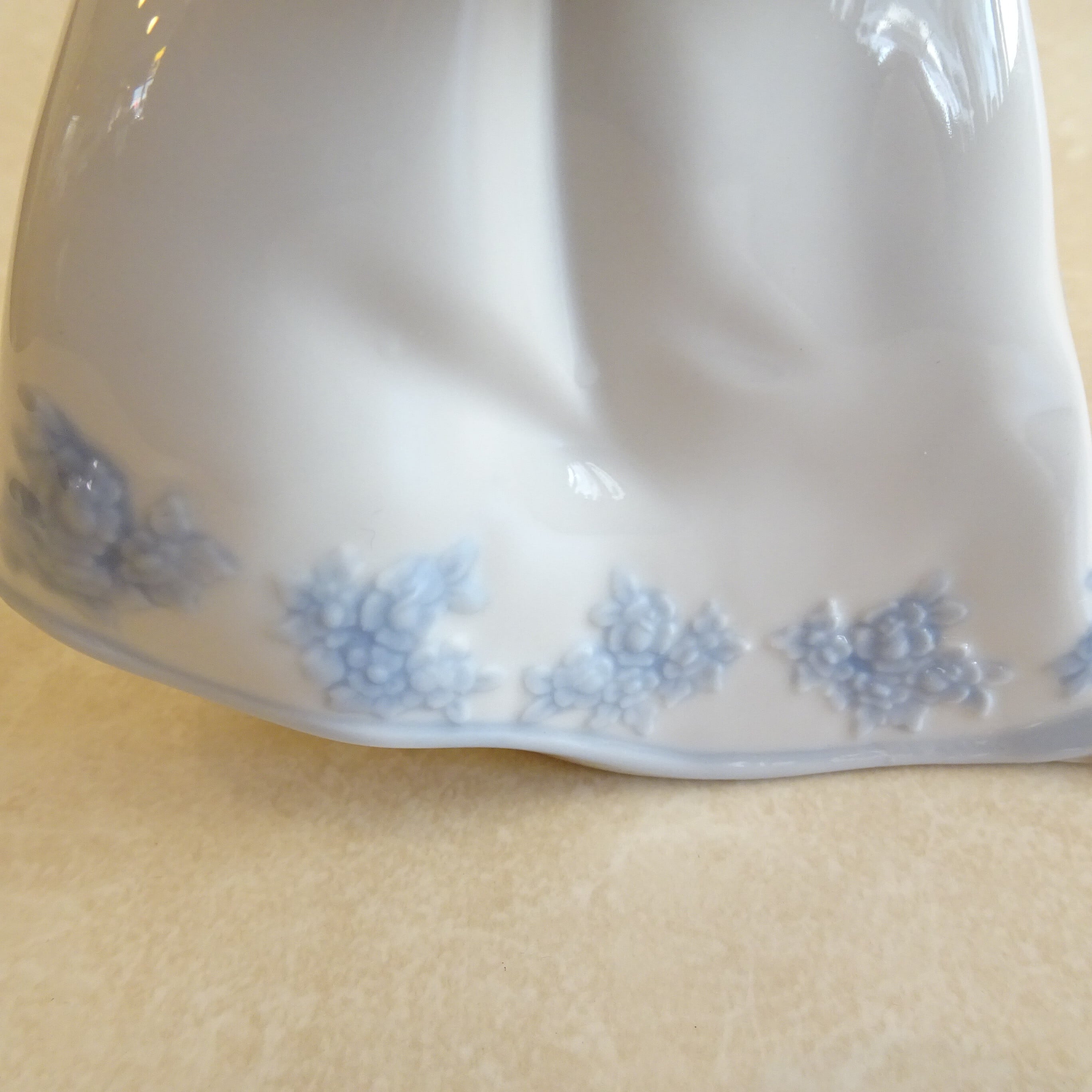 スカートの淡いブルーのバラの刺繍模様がうつくしく、手指の先までとてもよくつくられています。リヤドロならではの、なめらかな陶器の質感と、やさしい色合いがたのしめるフィギュリンです。