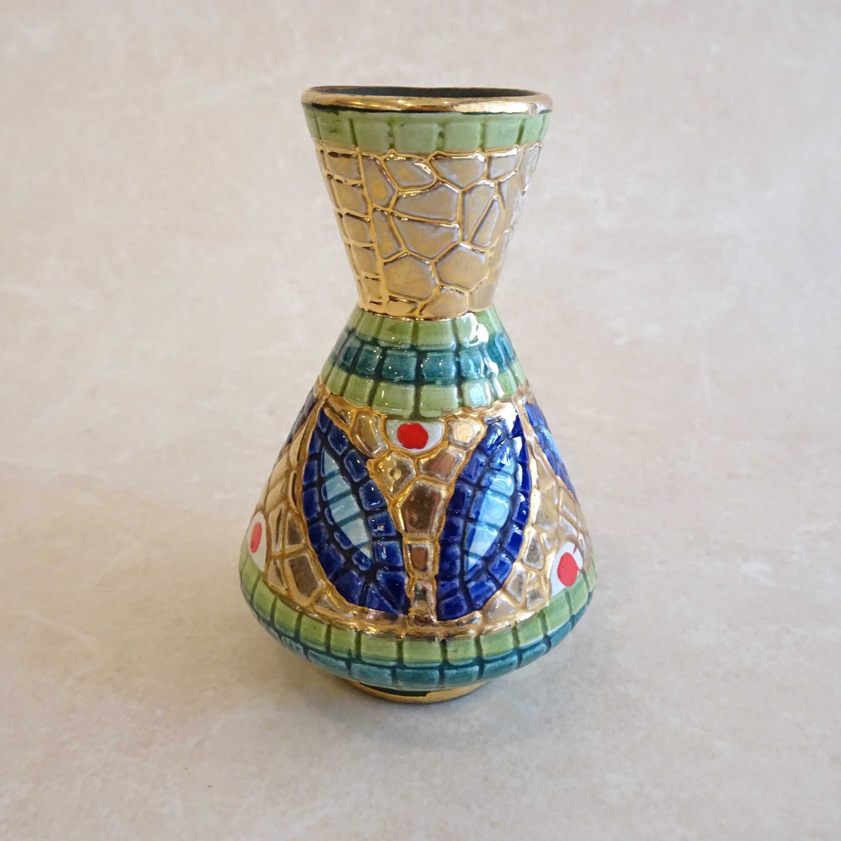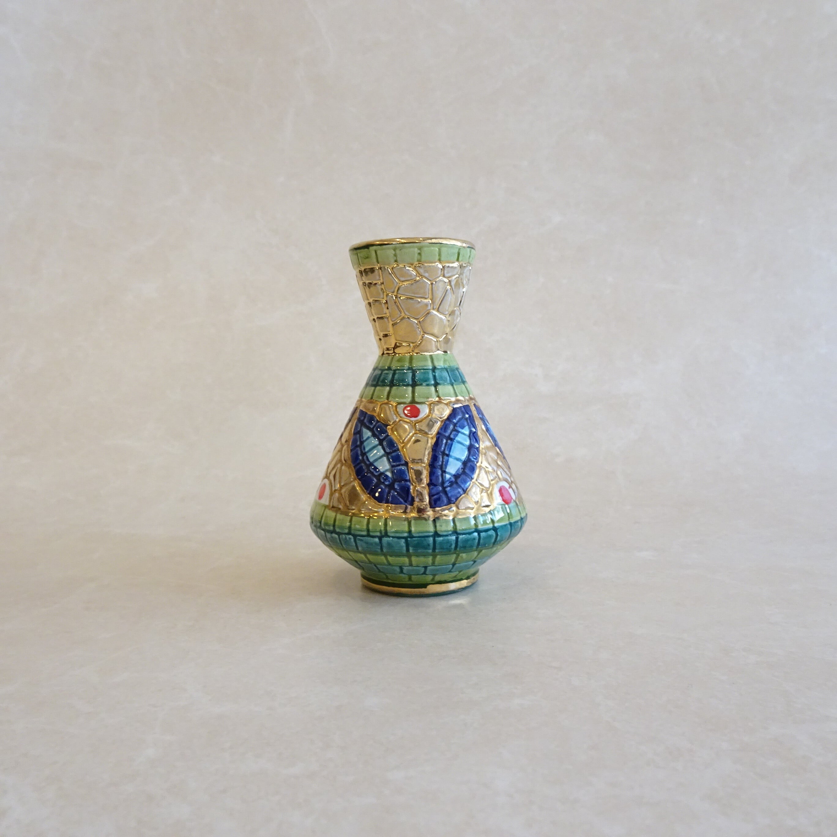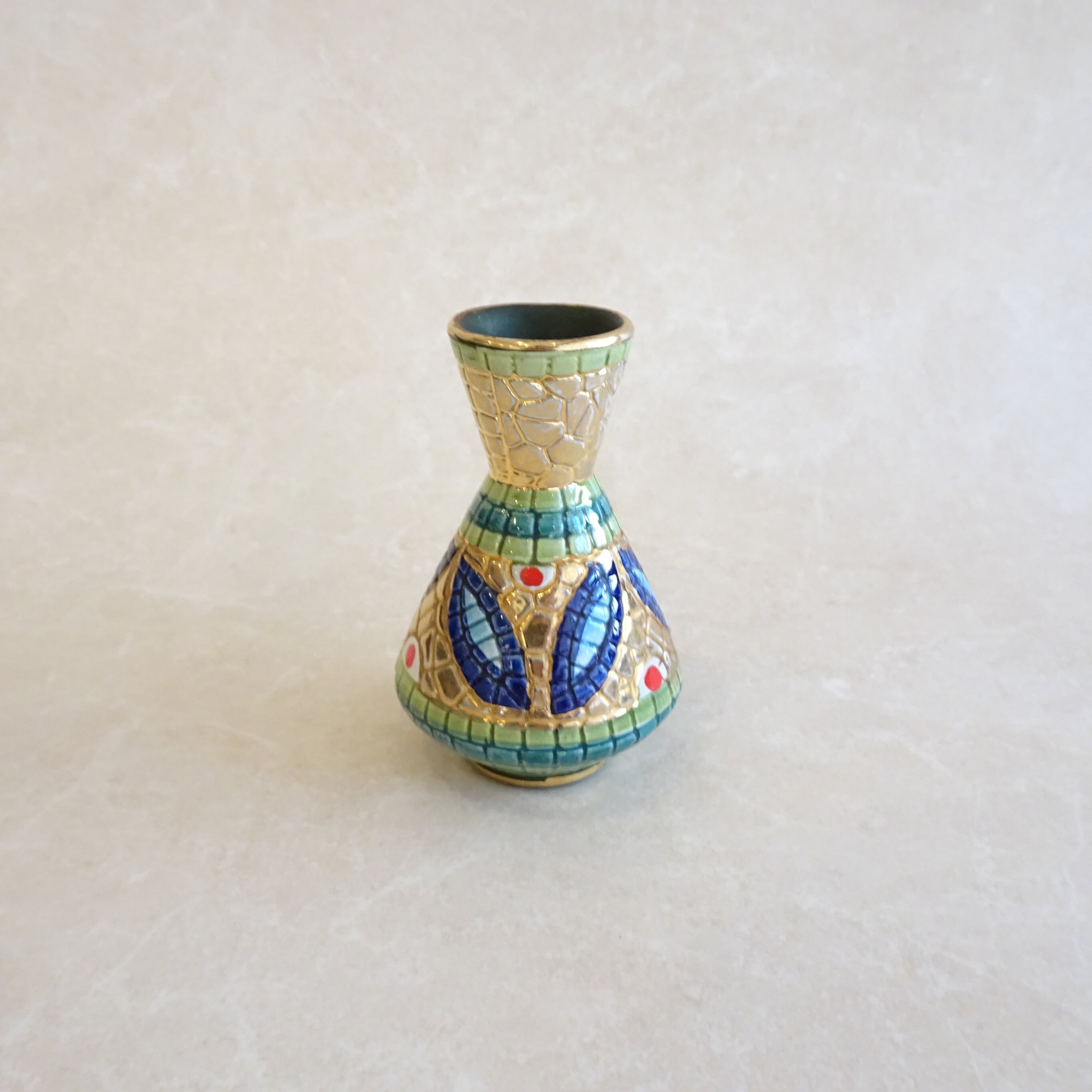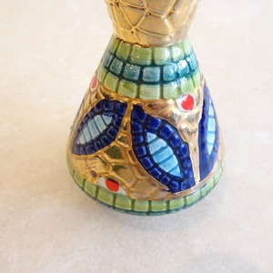 ミニタイルやモザイクガラスを貼り付けたような見た目ですが、凹凸をつくり彩色しているようです。