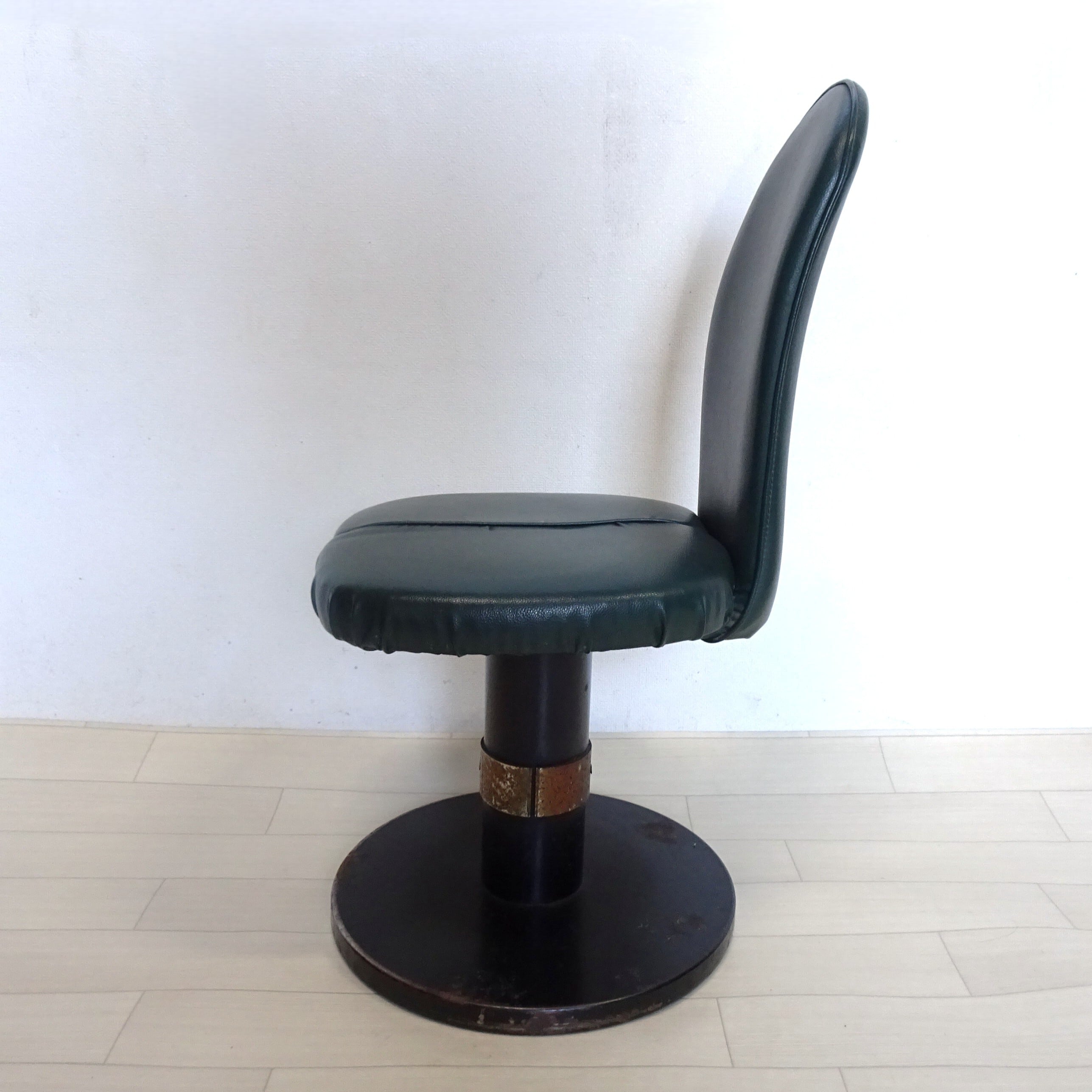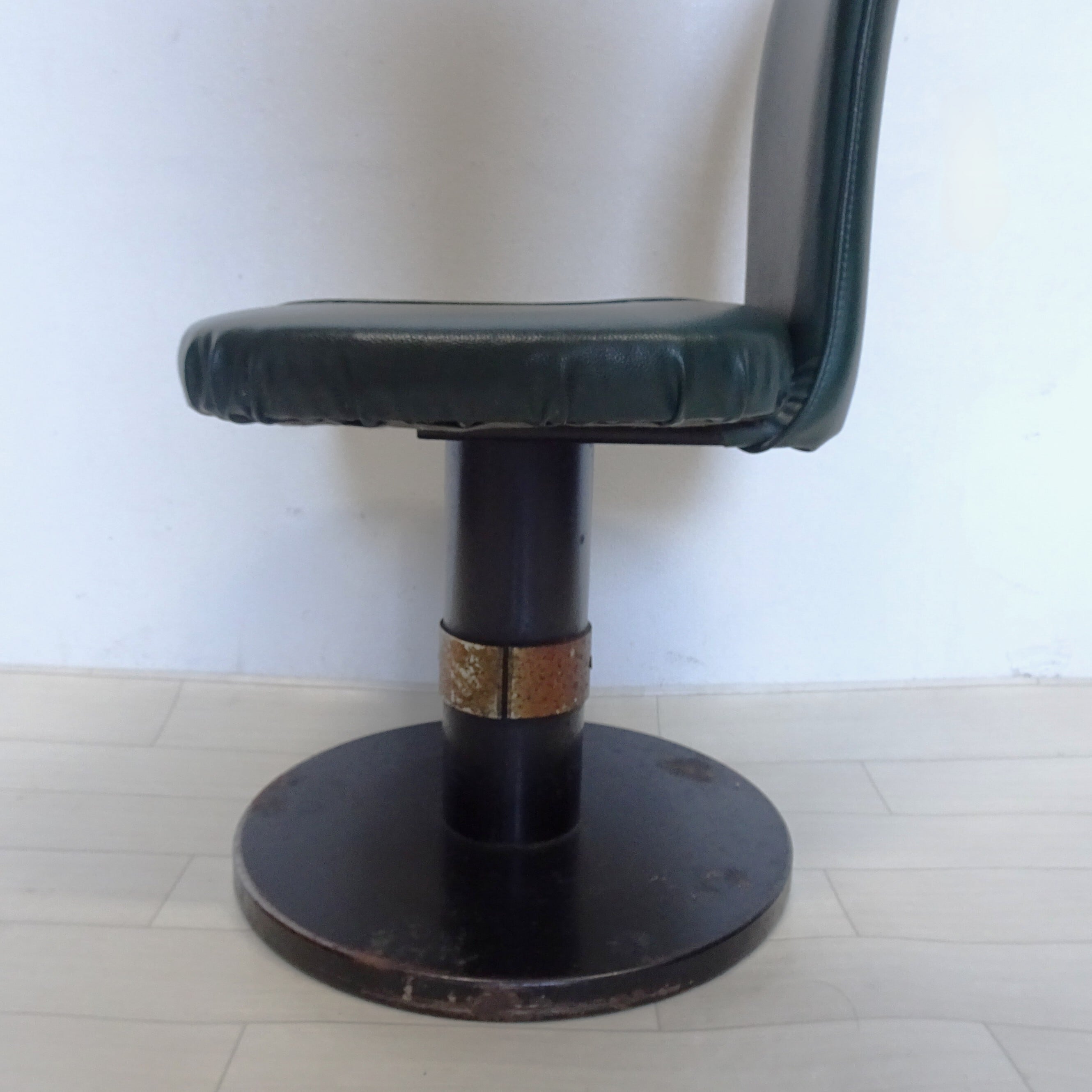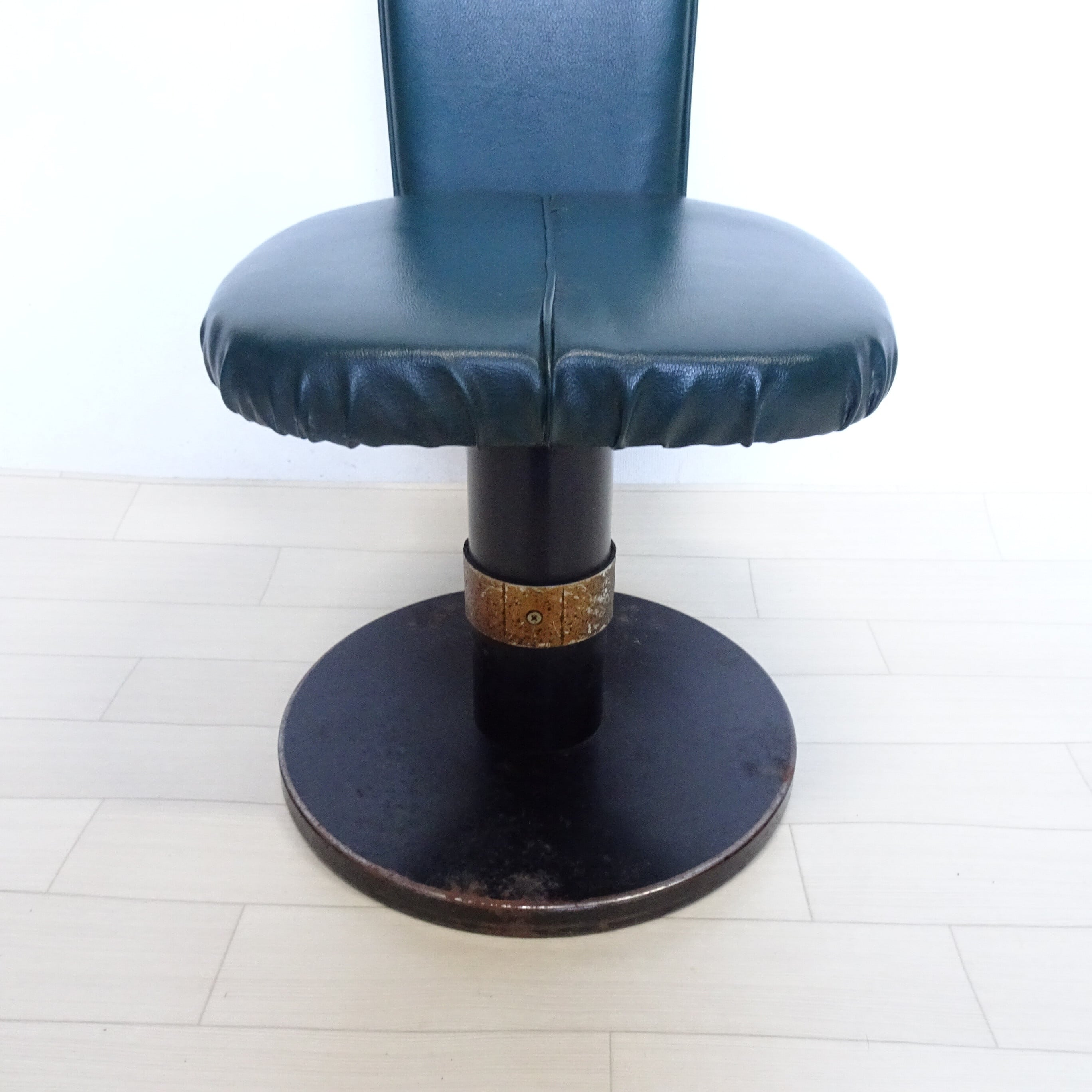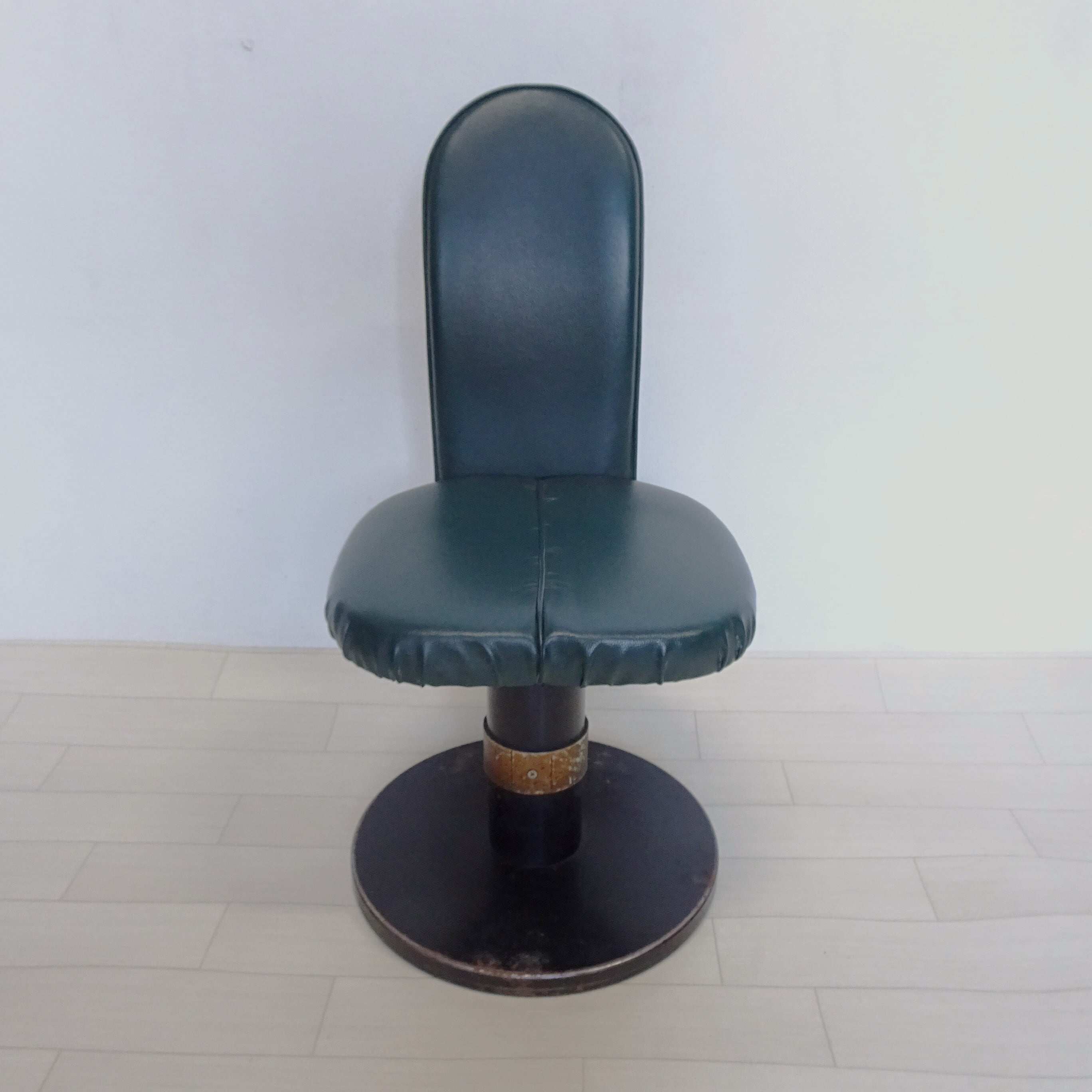 ずっしり重い鉄の一本脚に、深い緑のシートが特徴的です。