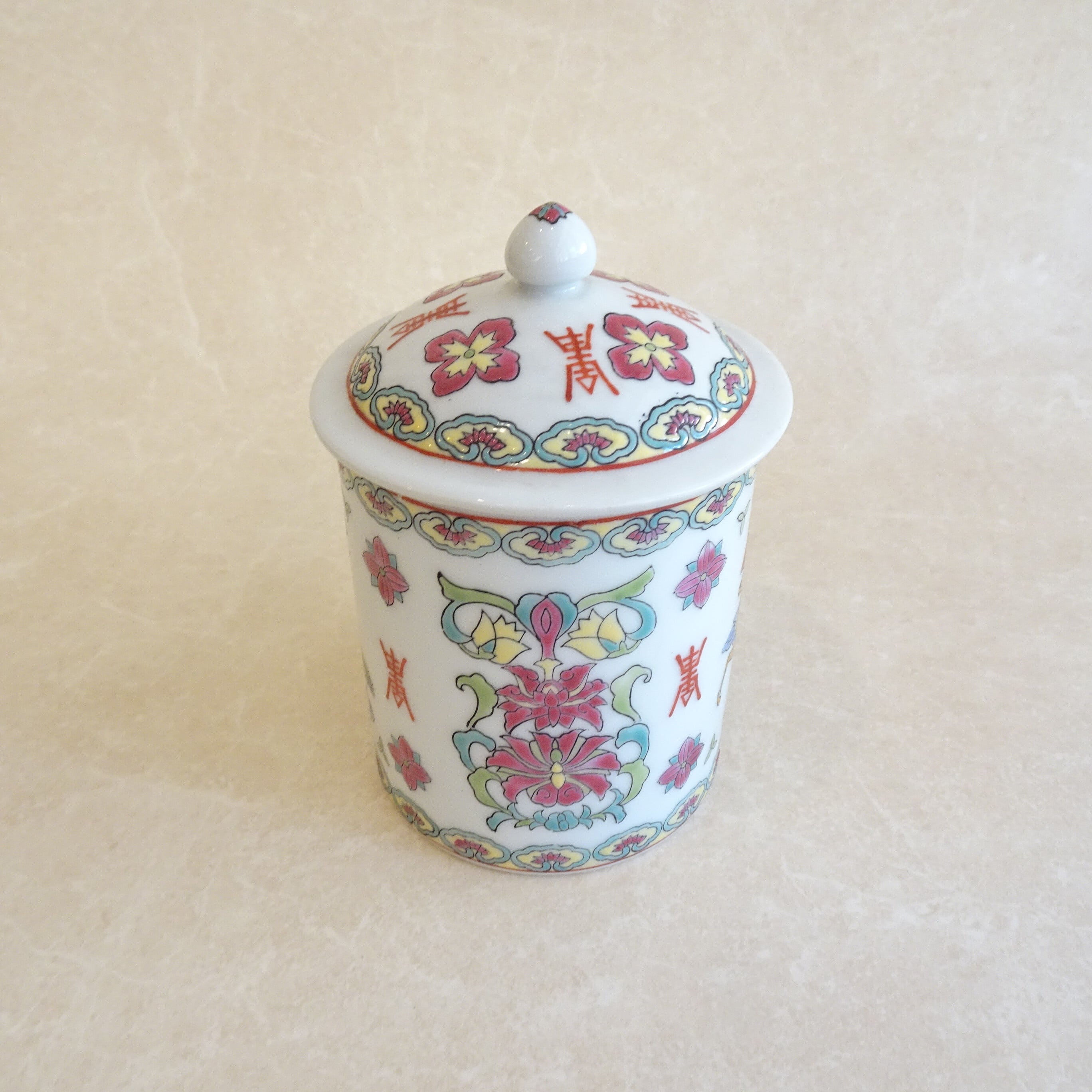 吉祥文づくしの古いふた付きマグカップ