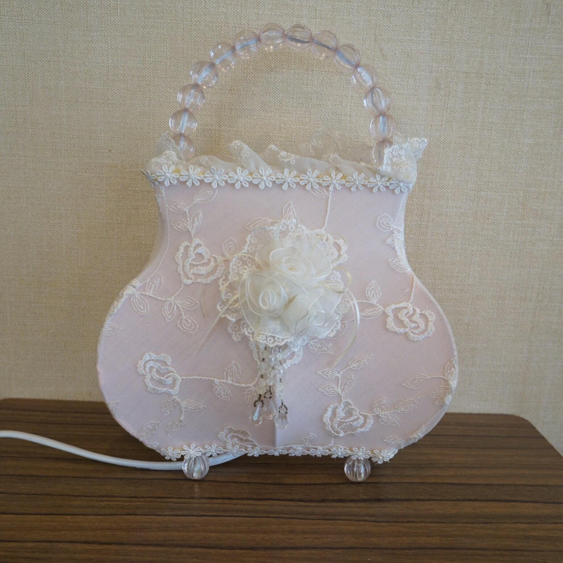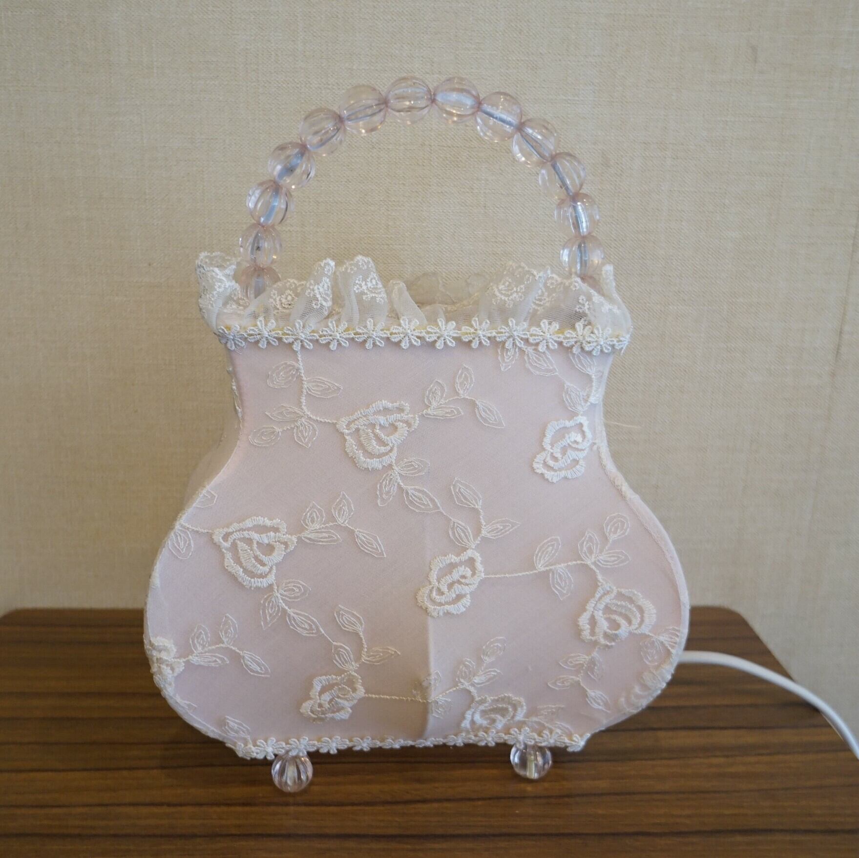 光を透過する布地に、花のレースがあしらわれています。取っ手、脚部分はアクリル製です。
