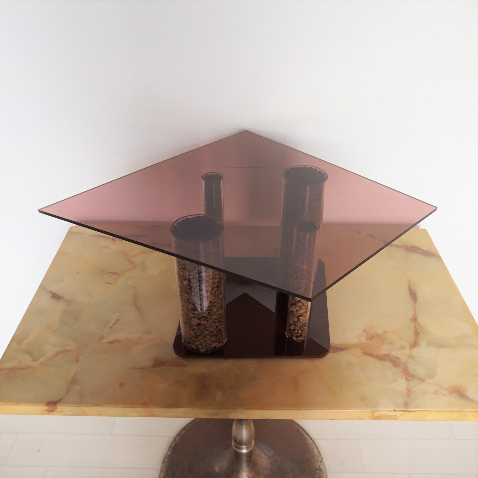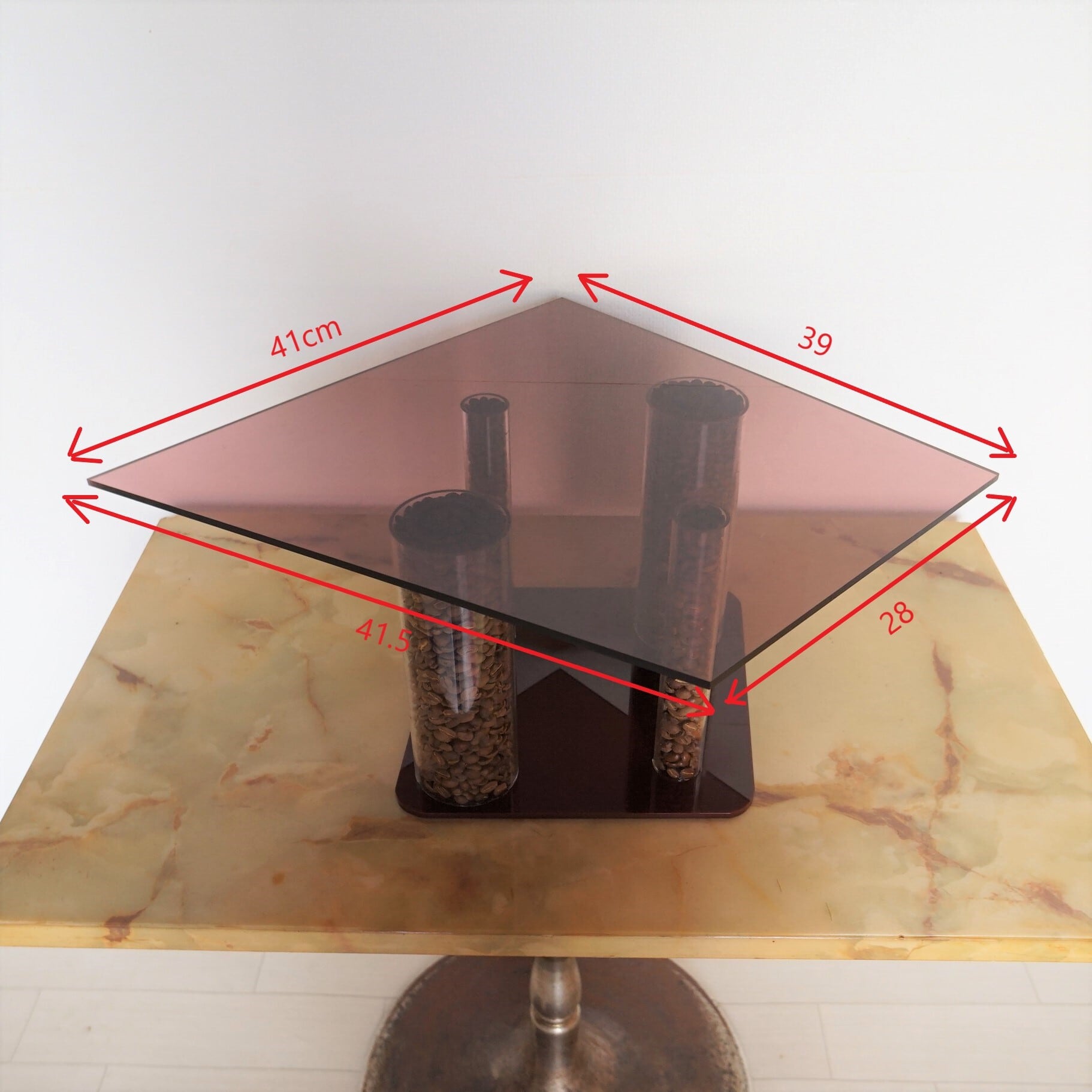 大きさの異なるアクリル板の間に4本の筒が貼り付けられ、筒の中にはコーヒー豆が入っています。上下のアクリル板は正方形ではありません。サイズは画像にてご確認ください。
