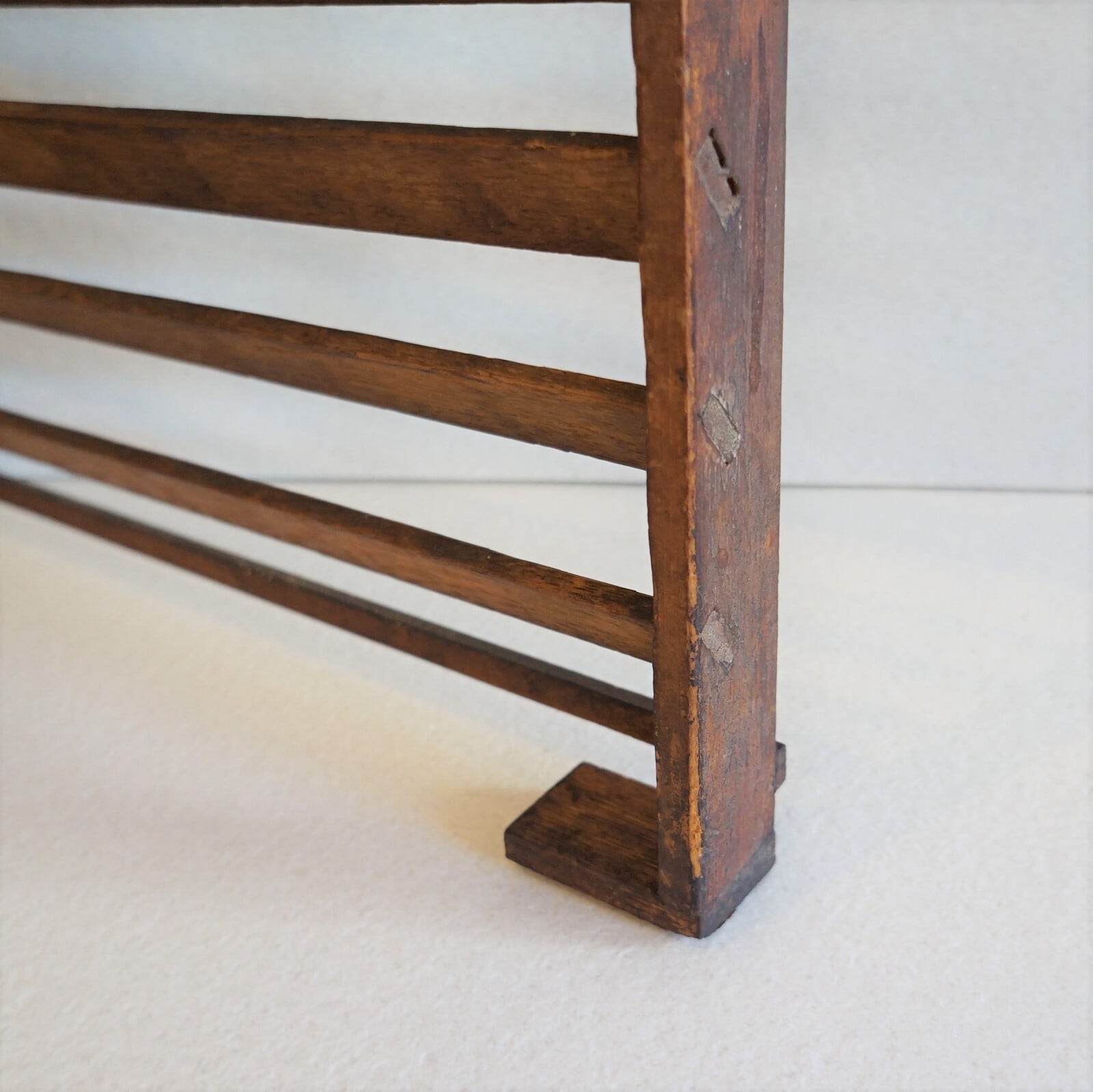 5本の細い木板が斜めに付いており、1本の板は幅が約2.8cm、厚さ約6㎜ですが、板や部分的にさらに細くなったり厚くなったりしている箇所もあるかと思います。サイズはおおまかな参考としてください。