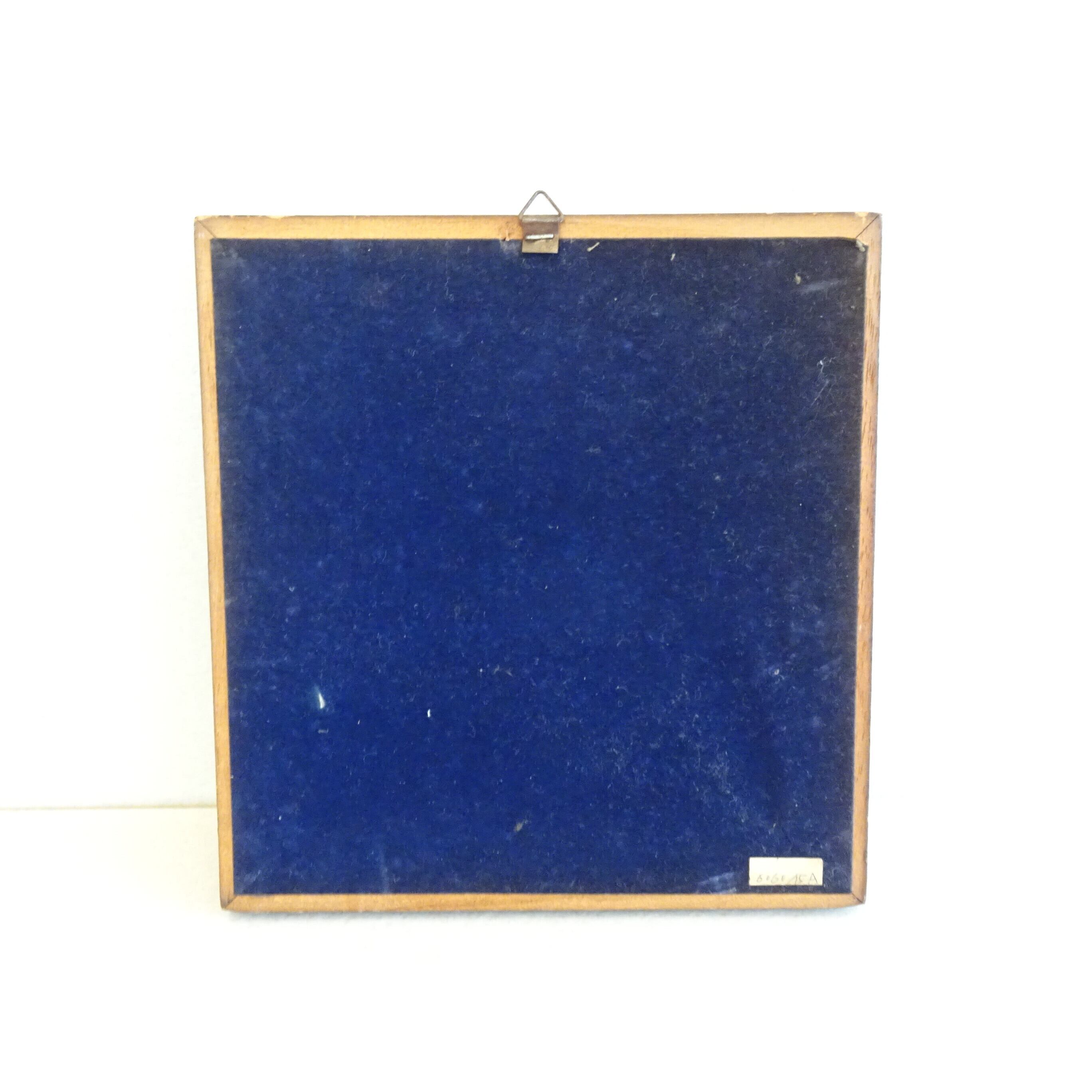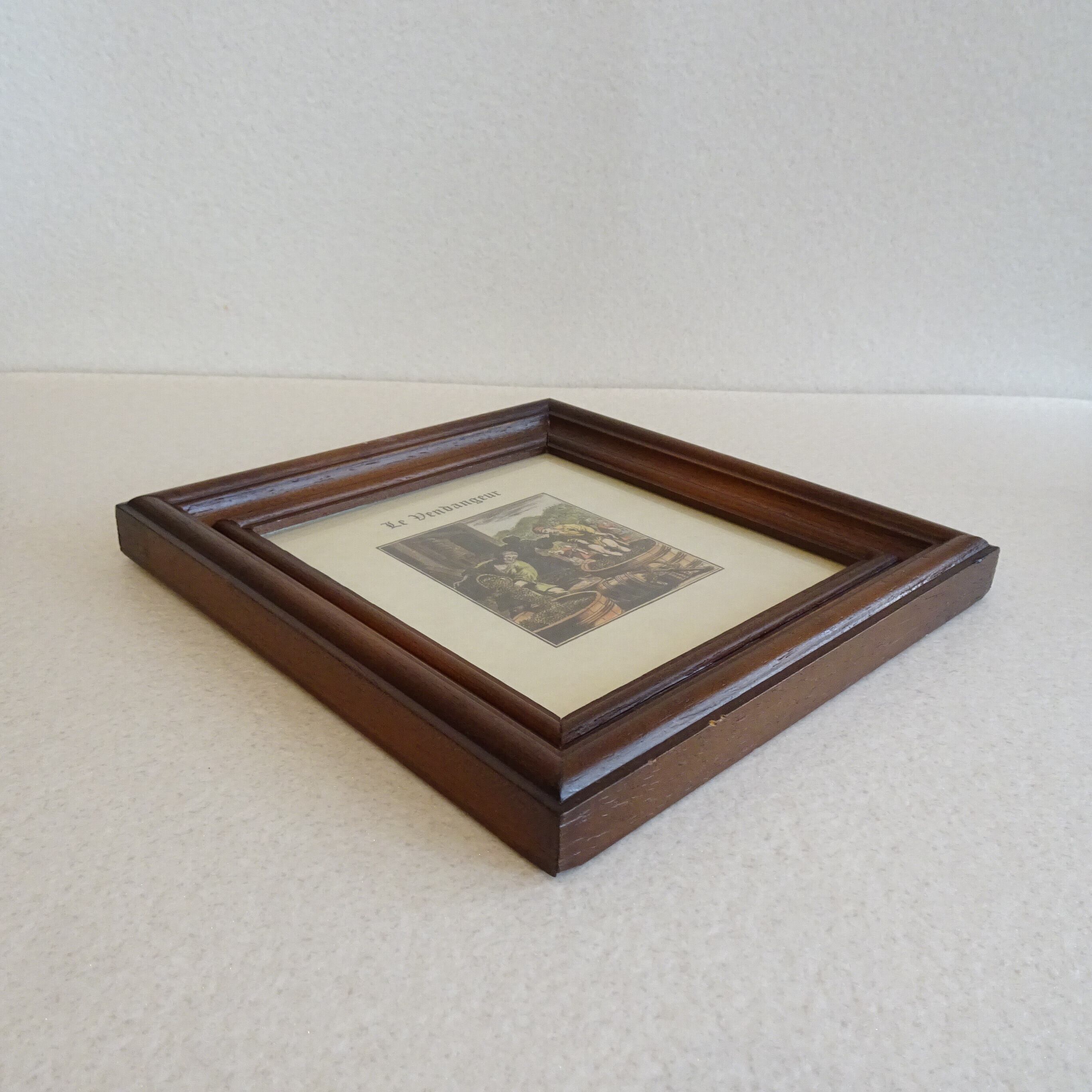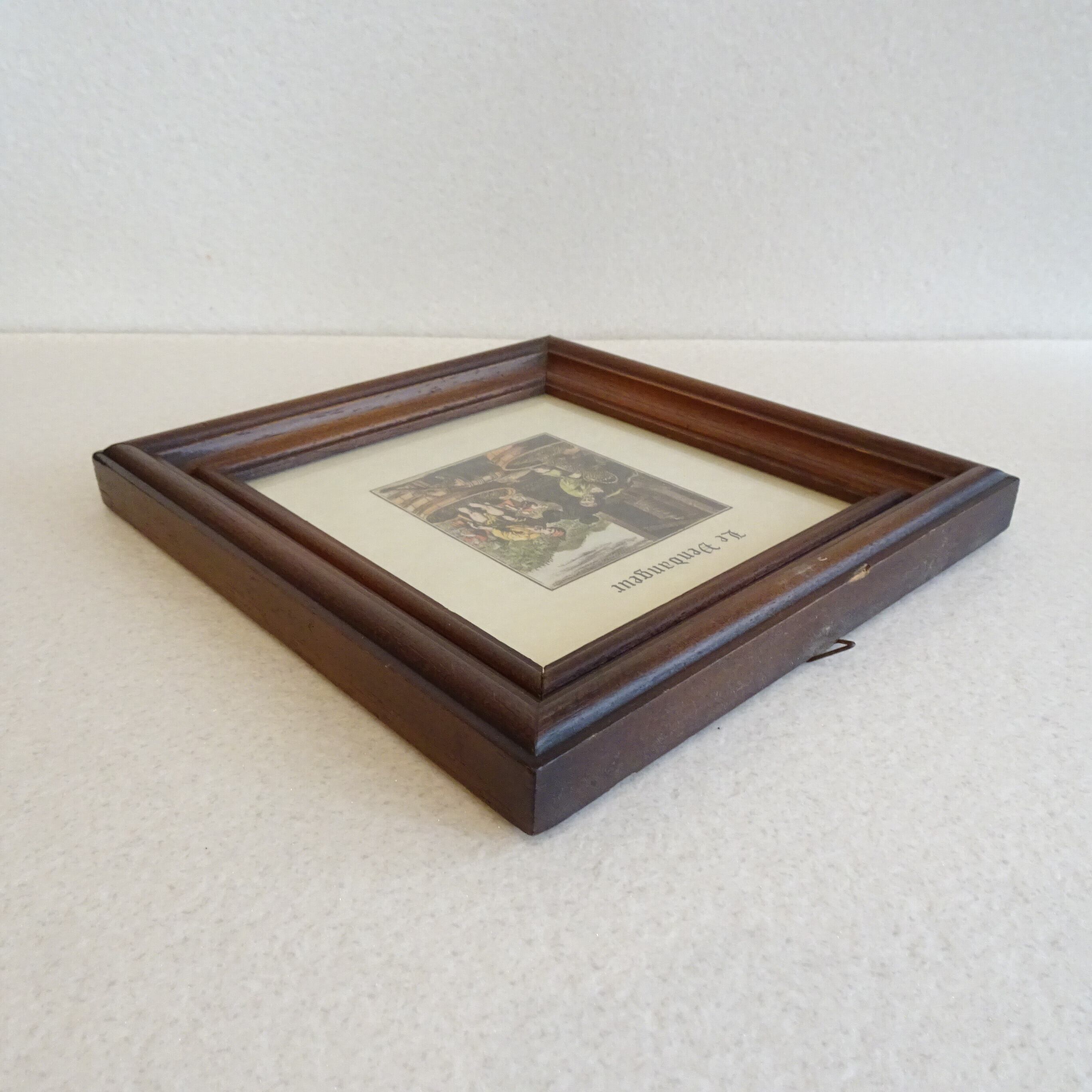 木製の額にプリントされた版画が飾られています。表面はガラス板です。裏面には薄いベルベット地の紙のようなものが貼られており、中を取り出すことはできません。
