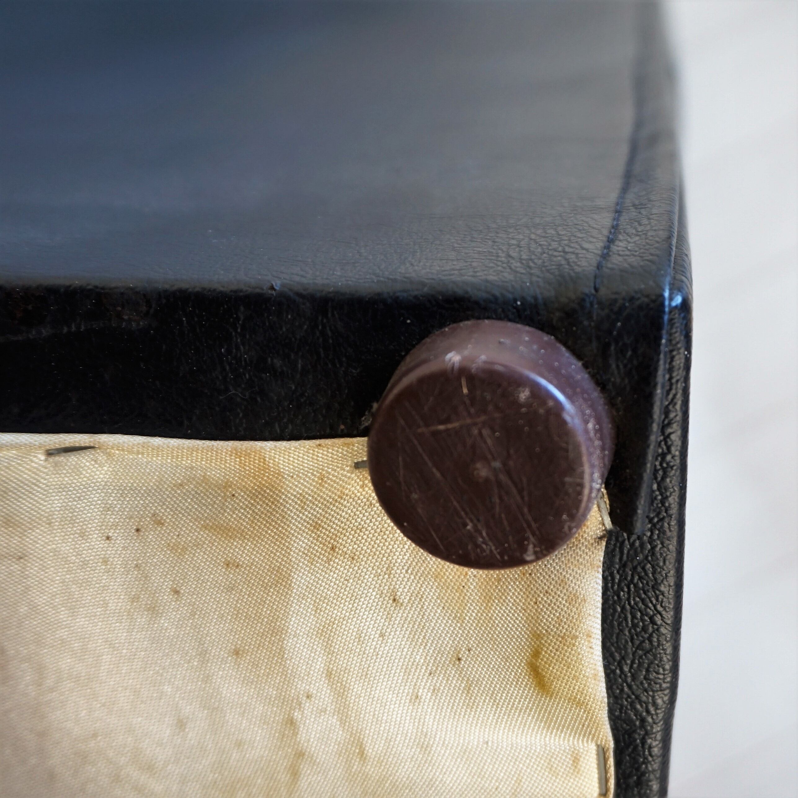 裏地は汚れが生じてしまっていますが、裏地の張り替えは行わず、清掃を行うのみとしました。タッカー(裏地を本体に留めているホチキスの針のようなもの)が外れているもの、さびが生じているものに関しては打ち替えを行いました。